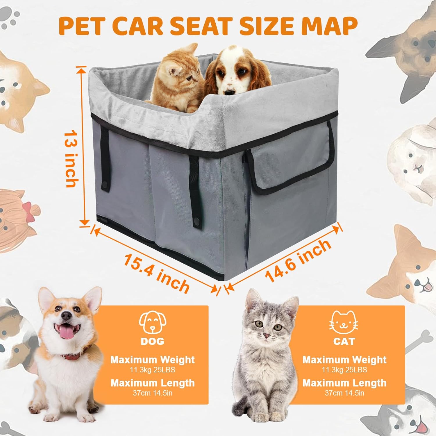 - Dog car seats for small dogs: Pet carseat car seat measures 15.5 in (L) X 14.6 in (W) X 13 in (H) and is recommended for dogs and cats up to 25 lbs