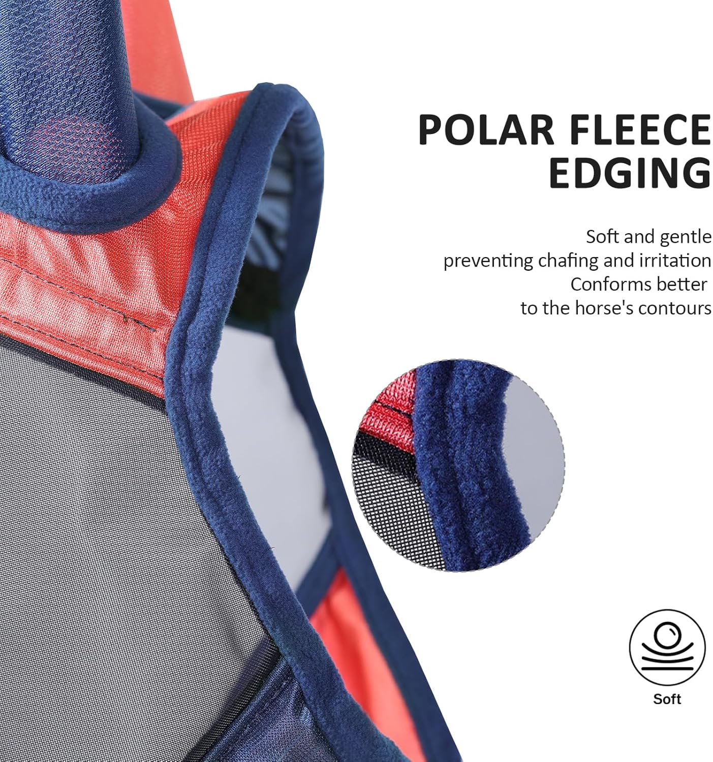 - Large Eye Space: Features two thick fleece paddings on the forehead and over the nose, reducing pressure marks and preventing insects from getting in. Eye darts help lift the mask away from your horse's eyes, creating a safe distance.