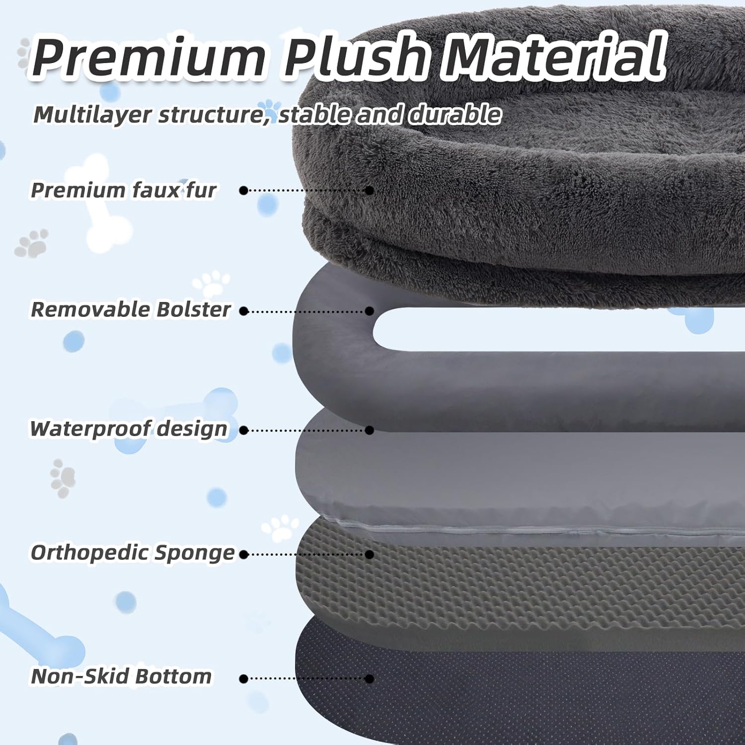 - Moms Embracing-like sense of security: 71*45*12 IN Dog beds for Large dogs provide oversized surround, The thick bolster allows you to tuck your hands and feet into it, just like lying in the arms of mom, warm, peace of mind. Effectively relieve your anxiety.