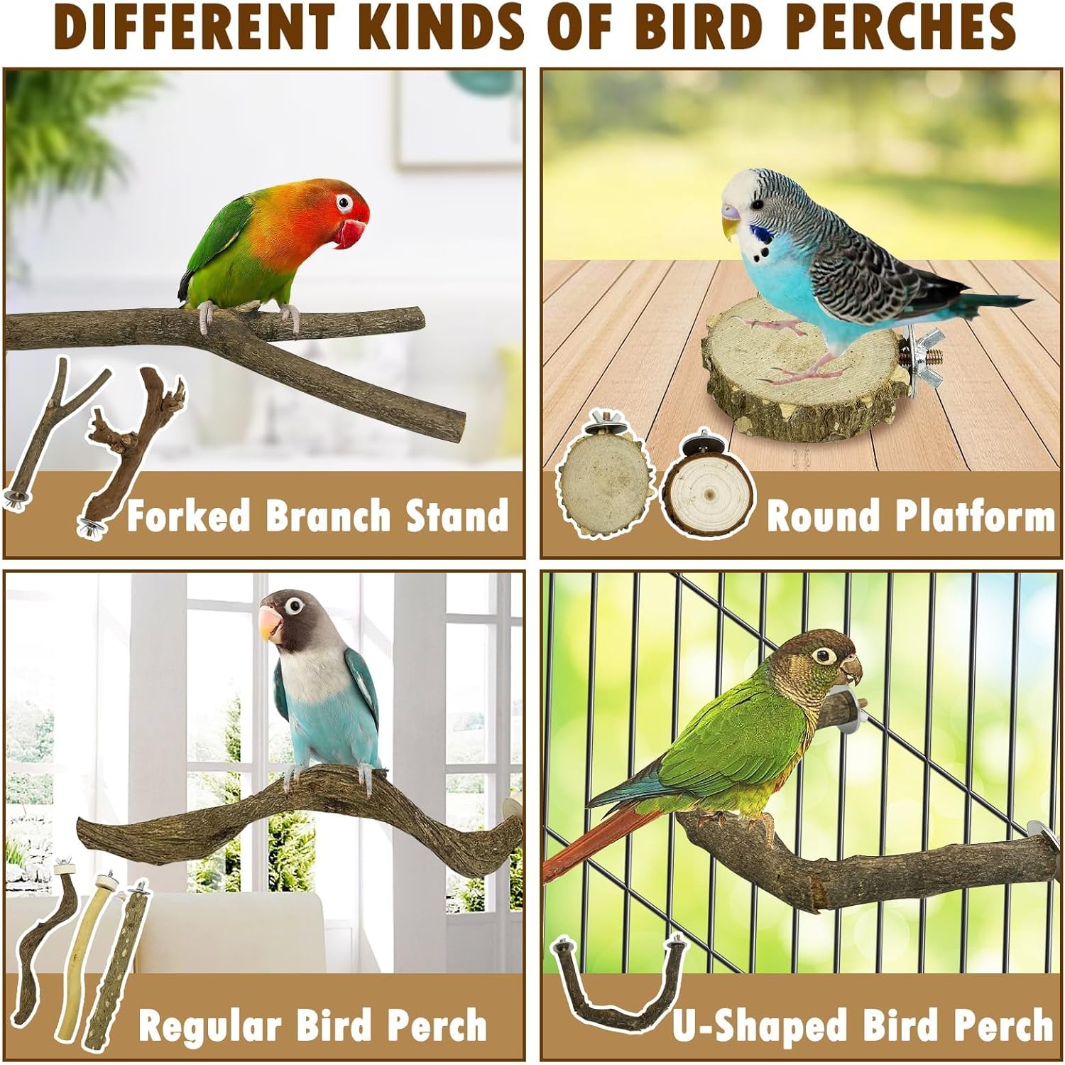 - Different Kinds of Bird Perches: Our natural bird wooden stand includes 8 different types of perches, 1 x forked branch bird perch,1 x U-Shaped bird perch, 2 x round platforms, and 4 x regular parrot perches.We provide the parts and various types of perches needed to assemble this bird perch stand to simulate a natural habitat for your birds and promote their natural behavior
