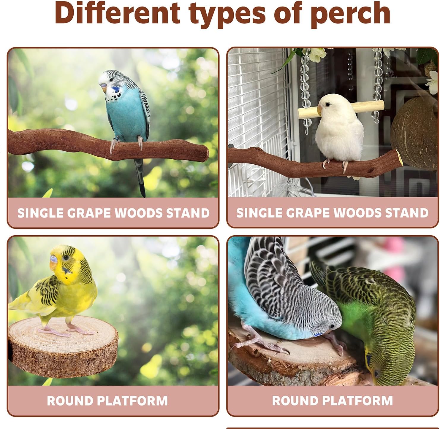 - [Different types of parrot perches]:- Create a natural habitat for your feathered friends with 3 grape stick perches, 2 parakeet perches.