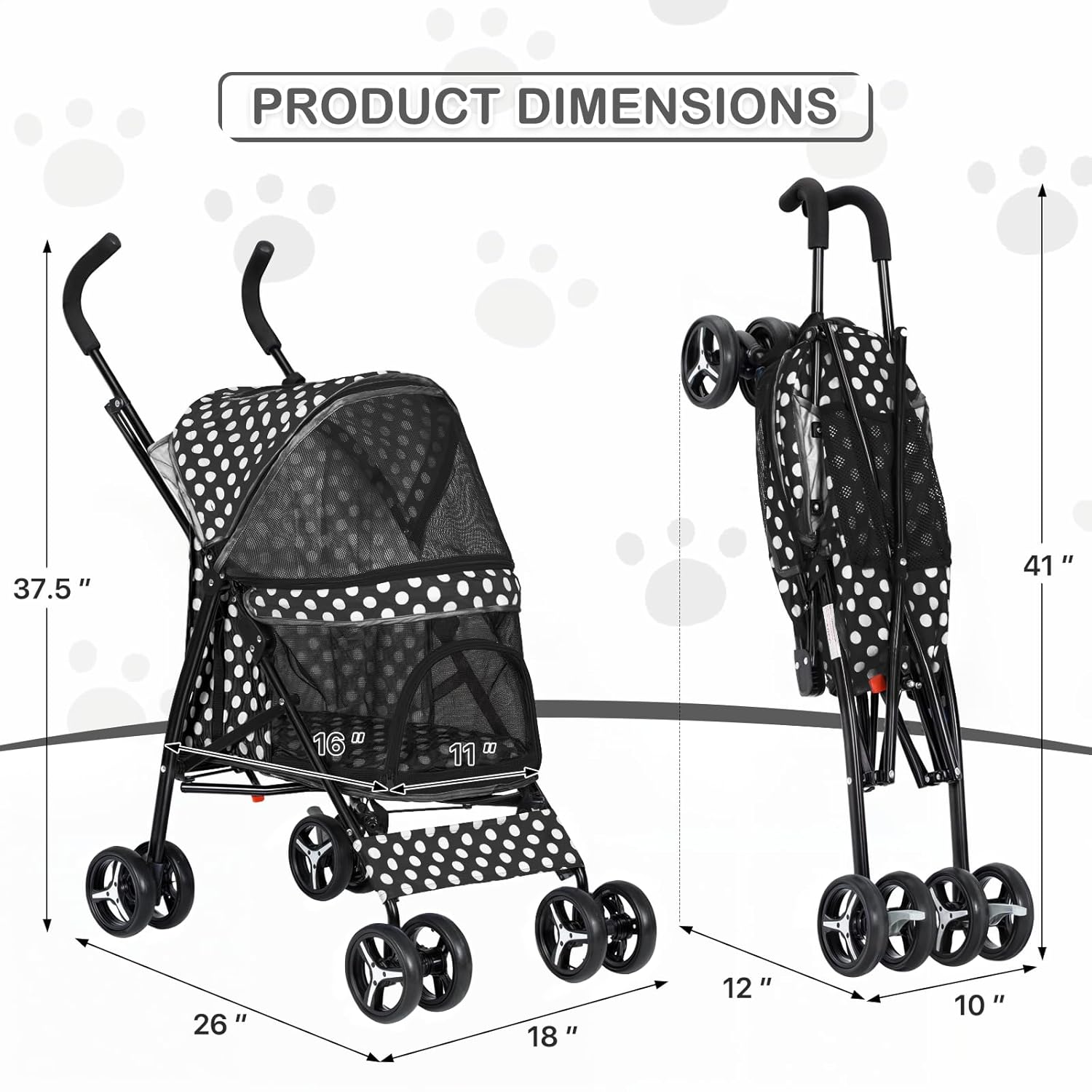 MoNiBloom 4 Wheels Pet Stroller, Easy-Fold Umbrella Shaped Dog Cat Jogger Stroller w/Storage Bag & Visible Mesh for Small/Medium Dogs Cats Black Polka Dots
