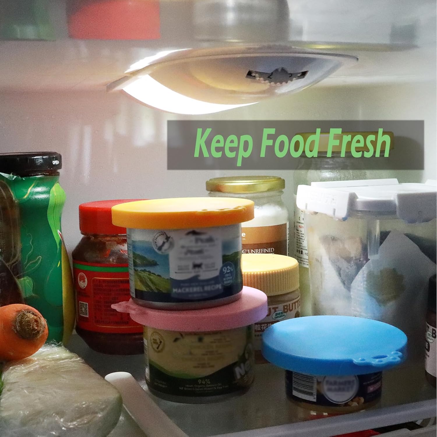 - UNIVERSAL SIZE: 4 x Cat Dog Food Can Lids Silicone covers (Pink/Green/Blue/Orange) & 1 x Pet spoon Can Opener (Pink). The lids have 3 different ring sizes with some stretch to fit most standard size pet cans. The can opener is also universal and can easily open a variety of cans.