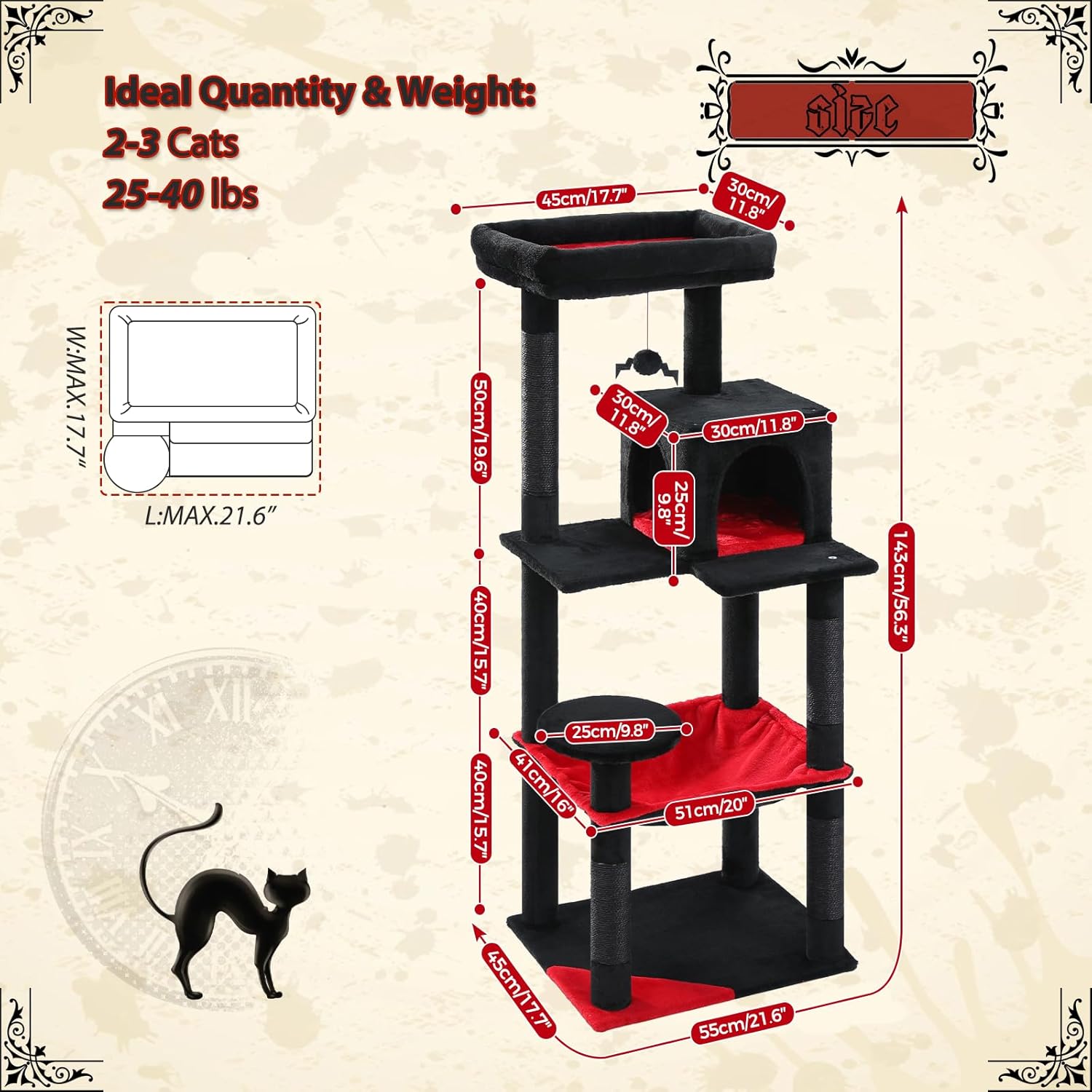 PETEPELA 56.3" Gothic Cat Tree for Indoor Cats, Tall Cat Tower with Super Large Hammock (20"X16"), Sisal Covered Scratching Posts, Cozy Condo and Top Perch Black