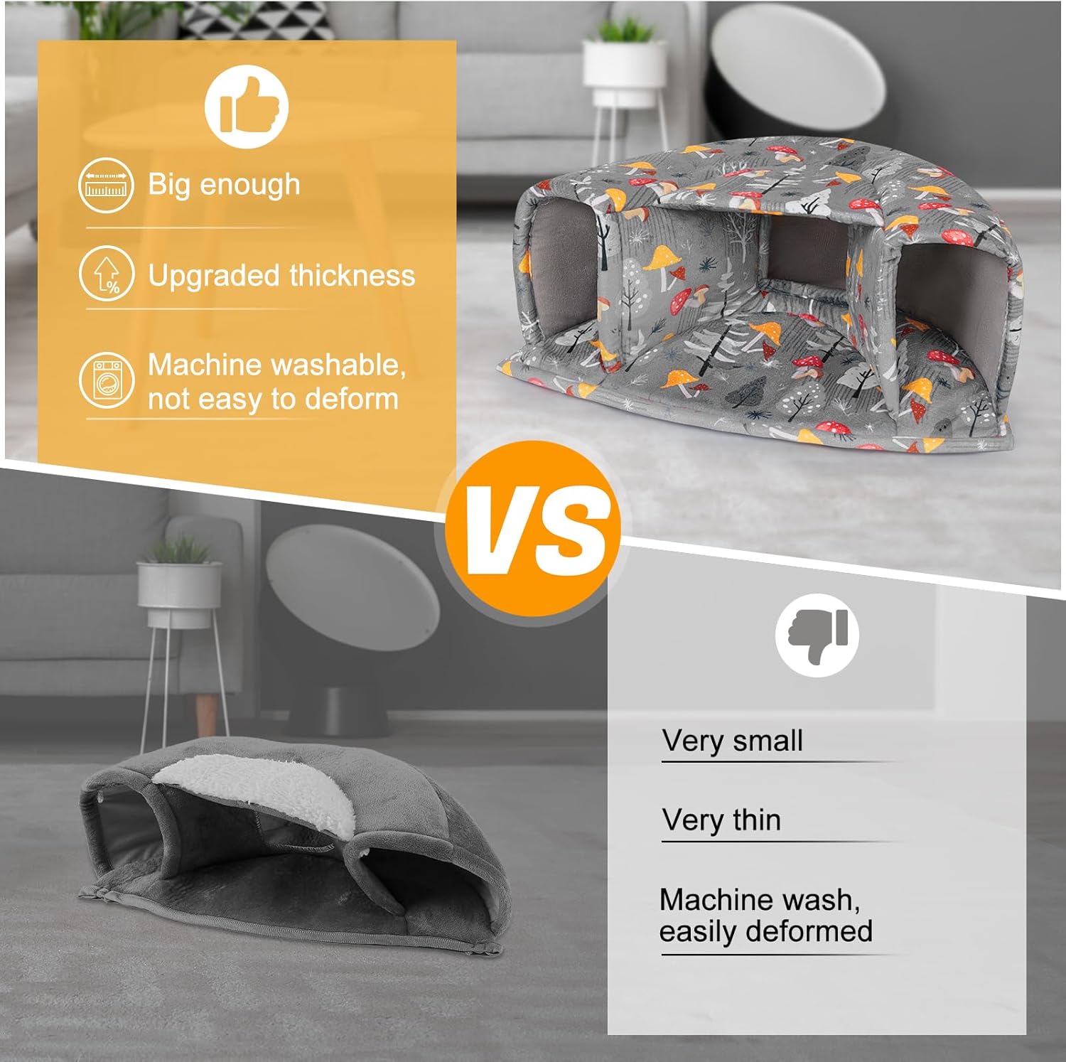 - Machine Washable: The guinea pig hideout is made of short plush and high-density elastic sponge; Not only is it very soft to the touch, but also more comfortable and warm, the fabric is thick enough to hold its shape and stay upright after many washes