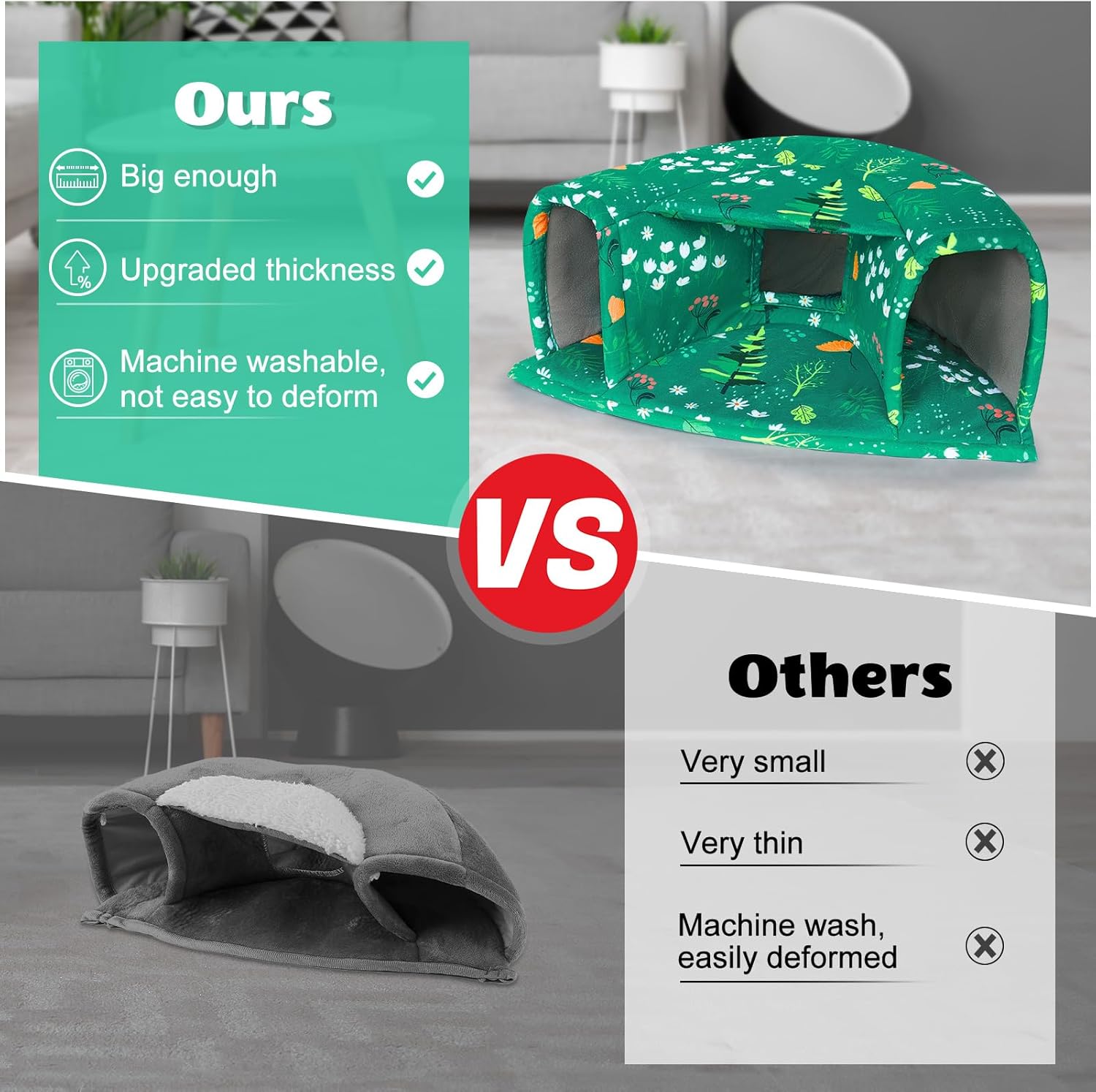 - Machine Washable: The guinea pig hideout is made of short plush and high-density elastic sponge; Not only is it very soft to the touch, but also more comfortable and warm, the fabric is thick enough to hold its shape and stay upright after many washes