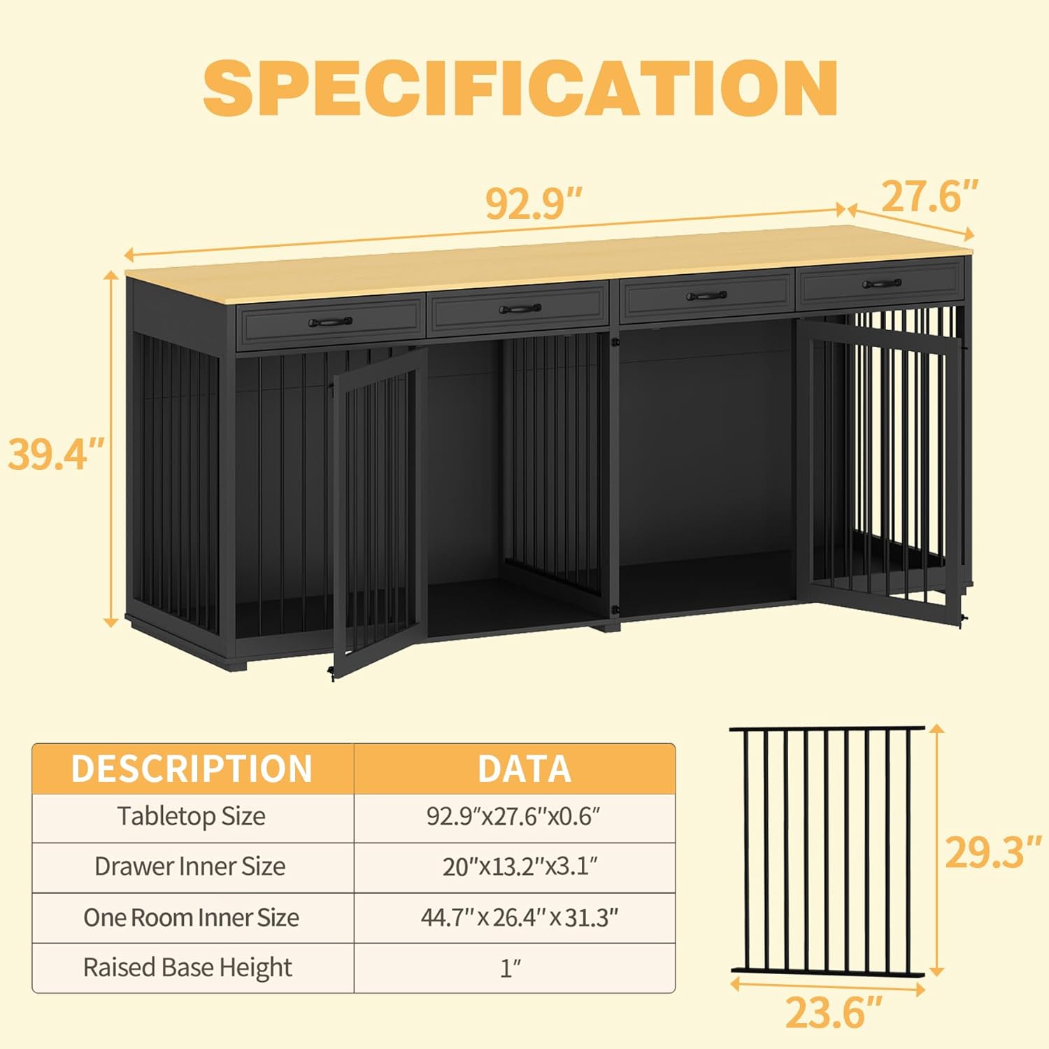 Extra Large Dog Crate with Double Rooms, 93" Heavy Duty Wooden Dog Cage Furniture Dog Crate Kennel w/Drawers & Removable Divider,Indoor Luxury Dog House for Large Dogs,Black