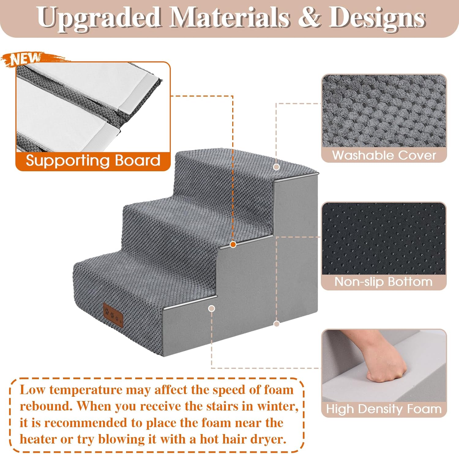 - 【ENHANCED STABILITY】GGIB dog stairs improve a new design with supporting boards, added between the foam stairs and the removable cover. They are fixed inside the cover. Pets can step on more stable and supportive stairs surface, preventing them from slipping when moving quickly.