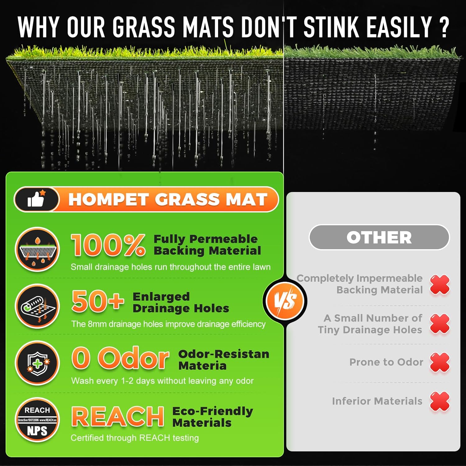 - 【THREE-LAYER SYSTEM】Large Pet Litter Boxes ( 52.7 x 35 in ) featuring High-Density Realistic Artificial Grass, Reusable Odor-Resistant Pee Pads, and Heavy-Duty Texture Tray. The artificial dog turf mat sits on top of a secure plastic drainage insert, directing urine into the durable collection tray while safeguarding your floor and carpet from messes an spills.