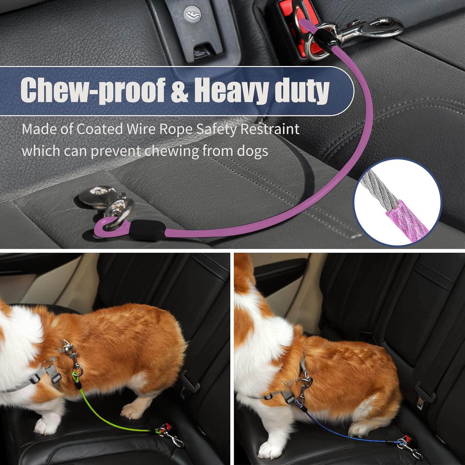 Dog Seat Belt Harness for Car,Dog Seatbelt of Coated Wire Leash Safety Restraint,No Chew Tether Cable Vehicle,Double Clips & Latch(Purple, 16 inch/40 CM)
