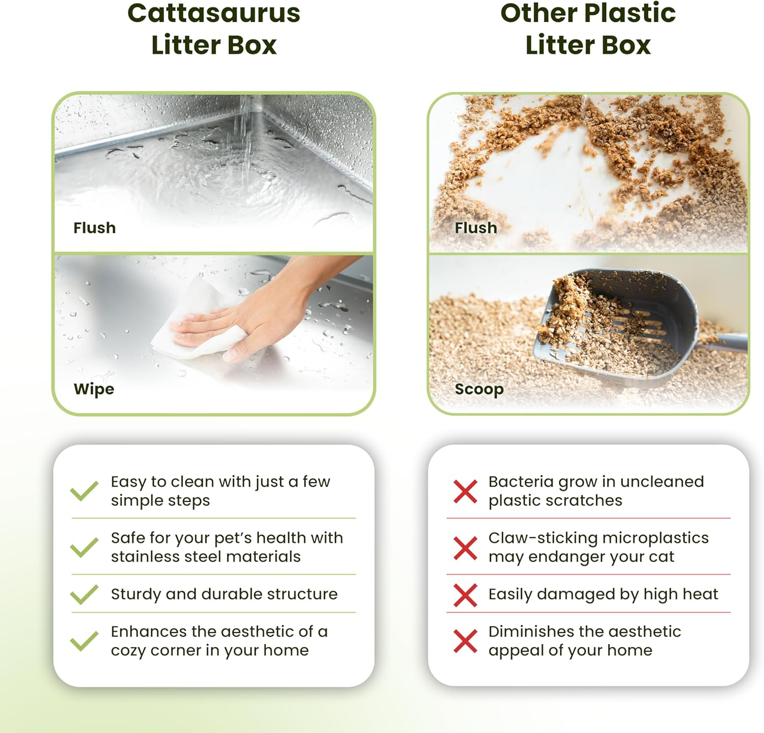 - Odor-Free Large Litter Box: The smooth surface of stainless steel doesn't absorb odors, maintaining a fresh environment even after prolonged use. Additionally, Cattasaurus stainless steel sifting litter box is easy to clean, simplifying maintenance.
