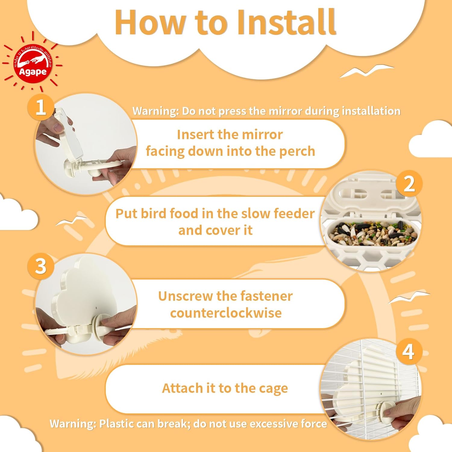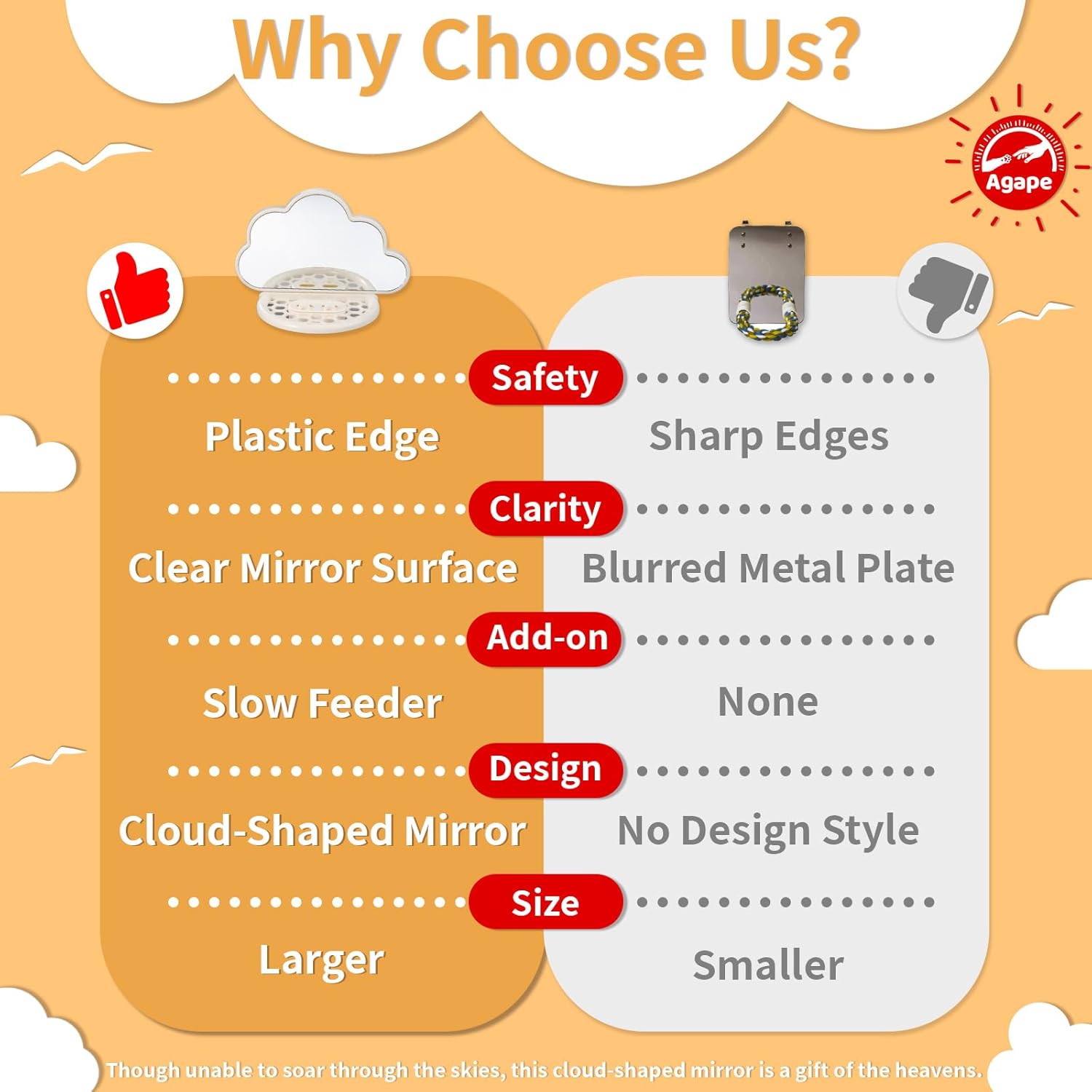 - 【Concept】Inspired by the soft, flowing shapes of clouds in the sky, our product symbolizes the freedom we wish for birds to have. While our birds may not soar high above, we can still gift them a special treasure from the heavens. If you have any questions or need assistance, Agape is here for you 24/7, ready to provide support whenever you need it