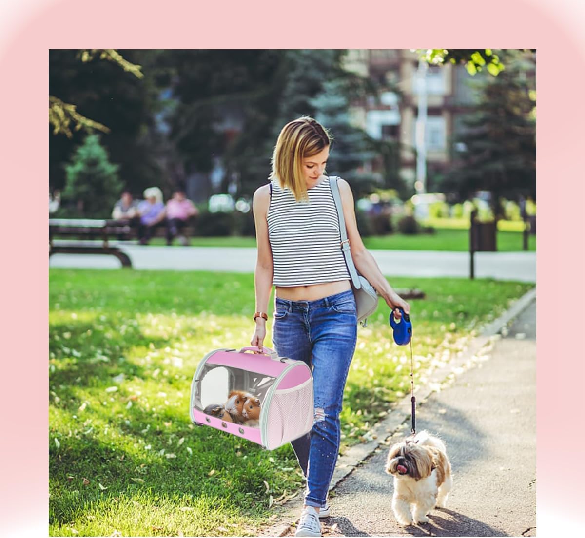 - 【Transparent Portable Design】1 transparent clear windows in front of the guinea pig carrier bring your pet closer to the surrounding environment,Allow you to communicate and interact with your pet ,3 vent holes in front and 1 side opening mesh door are designed to ensure fresh air and air circulation for your furry child and they can enjoy the scenery. There is a side pocket which is very convenient for you to foldable bowls, toys and store food.
