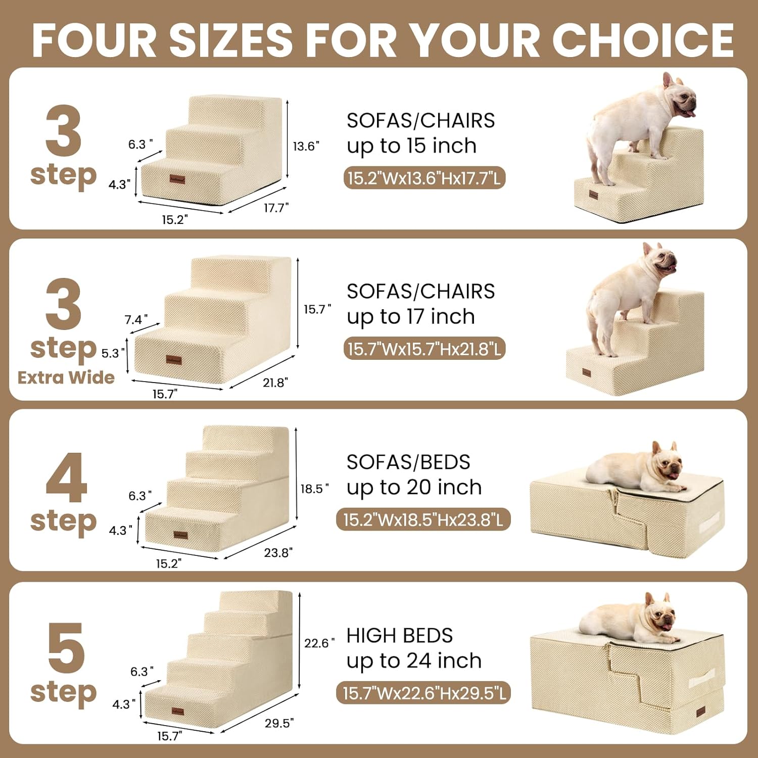 - DIMENSIONS AND SIZE OPTIONS; 3 step dog stairs with height 13.6 inches for couches up to 15 inches; 4 step dog stairs with height 18.5 inches for sofas and beds up to 20 inches; 5 step dog stairs with height 22.6 inches for higher beds up to 24 inches