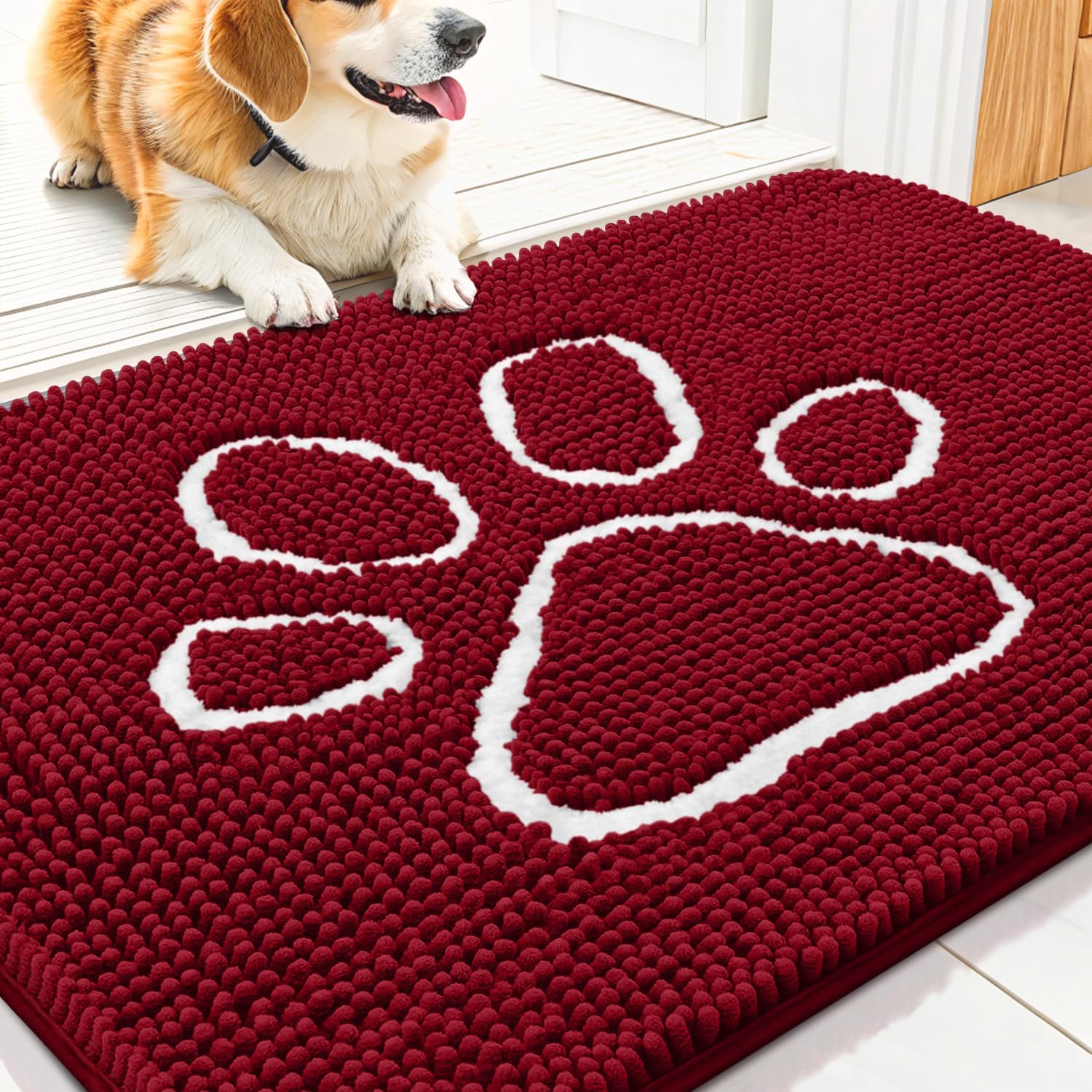 Smiry Dog Door Mat for Muddy Paws, Absorbent Dirt Trapper Non Slip Quick Dry Washable Chenille Mat for Mud Dogs, Entry Rug for Indoor and Outdoor (30x20 Inches, Red)