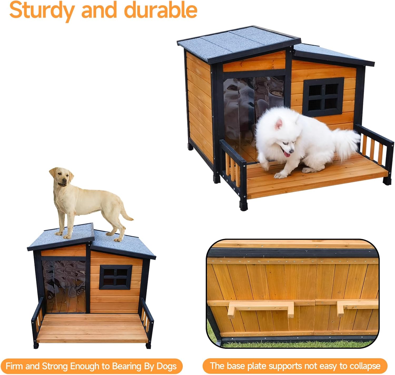 - Withstand Bad Weather:The outdoor dog house consists of a strong & sturdy pine construction. PVC curtain away from wind and rain. Heavy-duty mineral roofing felt and a weatherproof sealer provide ultimate protection for long-term outdoor use.Anticorrosive plastic feet can survive harsh outdoor conditions while preventing scratches on indoor floors.