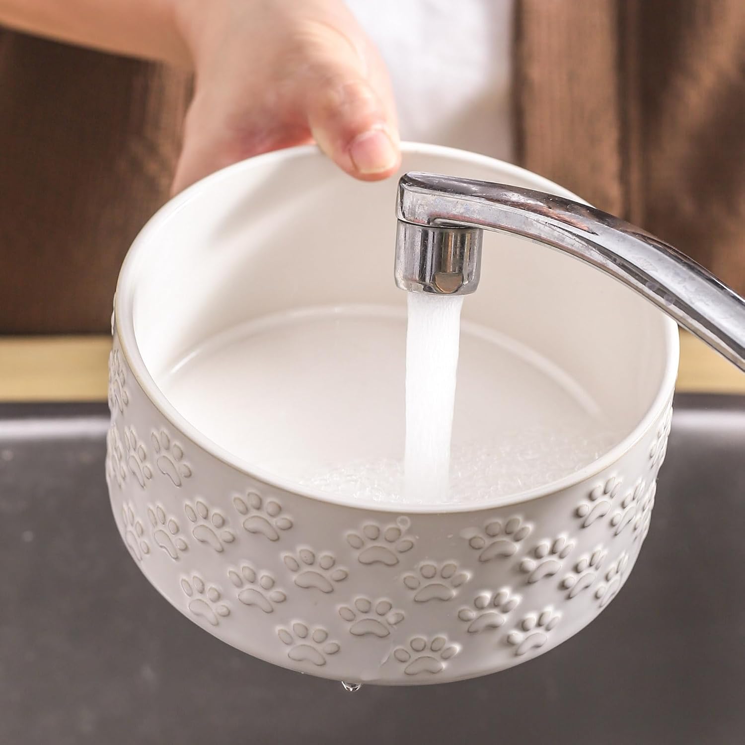 UBEE Ceramic Dog Food Bowl Set of 2, 6.1 inch Dog Dish Bowl with Paw Pattern, Pet Food Water Dish Feeding for Small and Meidum Dogs and Large Cat, White