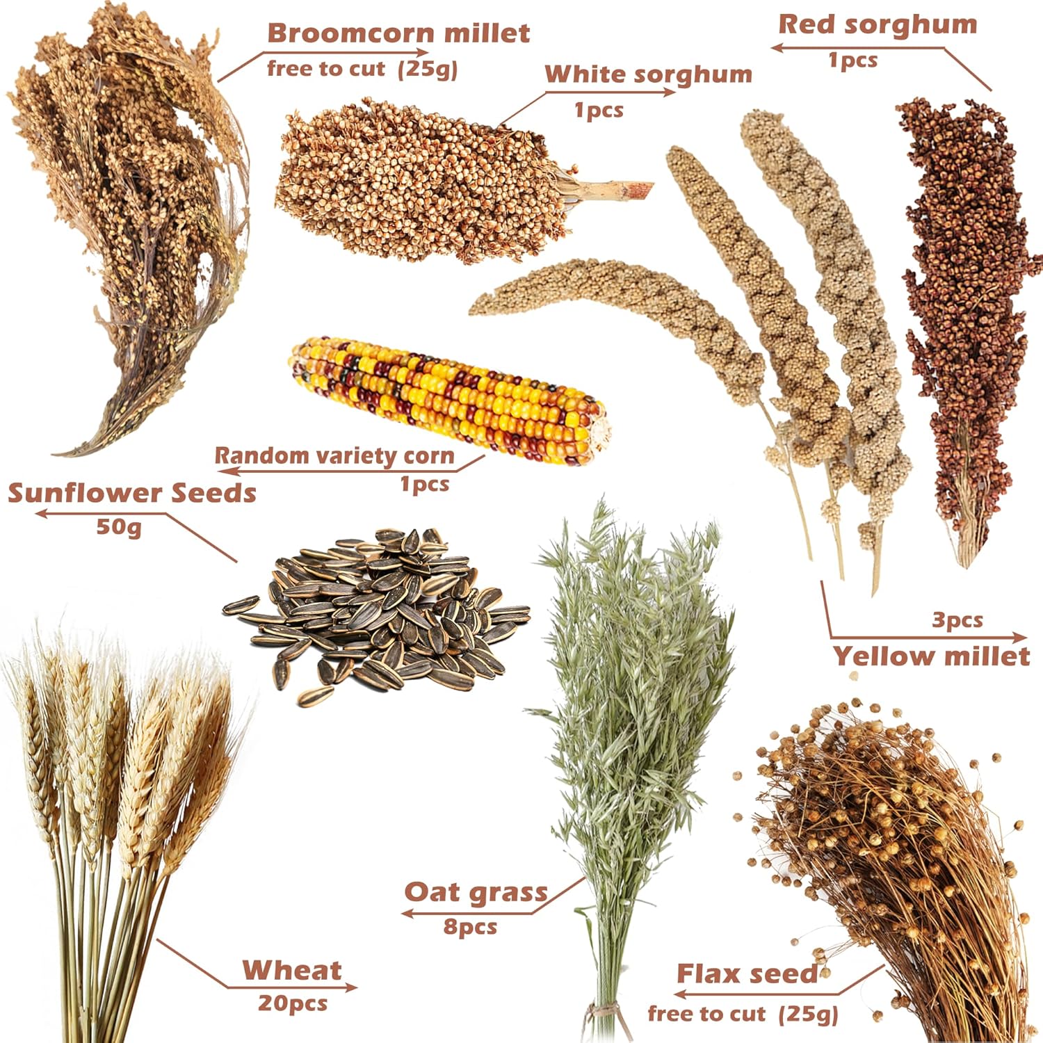 - What you get: You get: Kibble cob - 25g,Corn - 1 stick, Wild oats - 8 sticks, Sorghum - 2 sticks (one each white and red), Yellow cob - 3 sticks, Flax - 25g, Wheat - 20 sticks,Sunflower seeds-50g. These grains not only redecorate the hamster's home, but also provide more different textures to enrich their chewing experience and become new hamster toys to enrich their experience