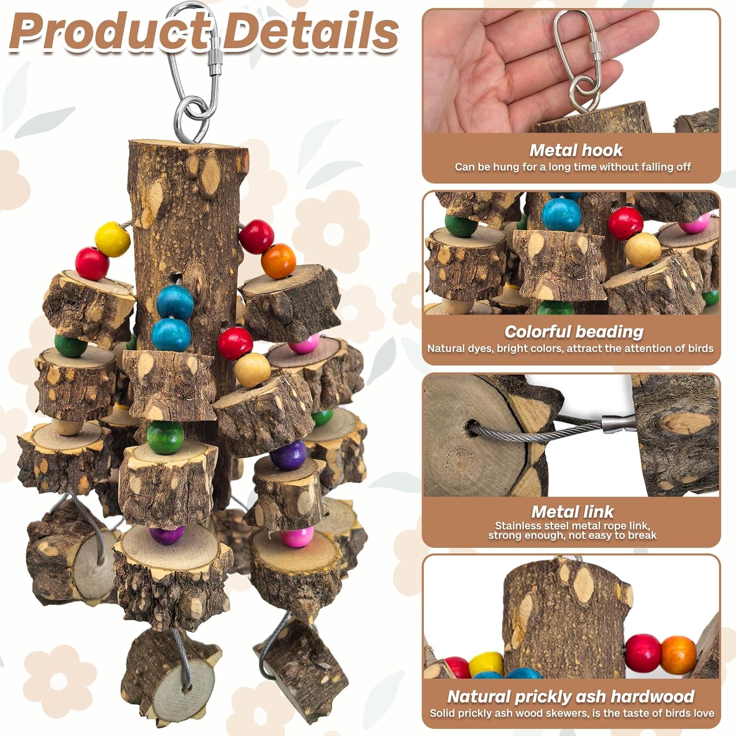 - Promote Dental Health: The combination of hard Sichuan pepperwood and colorful beads in our macaw chew toys not only provides a novel experience for your bird but also helps keep their teeth clean, prevent beak overgrowth, and keep teeth healthy