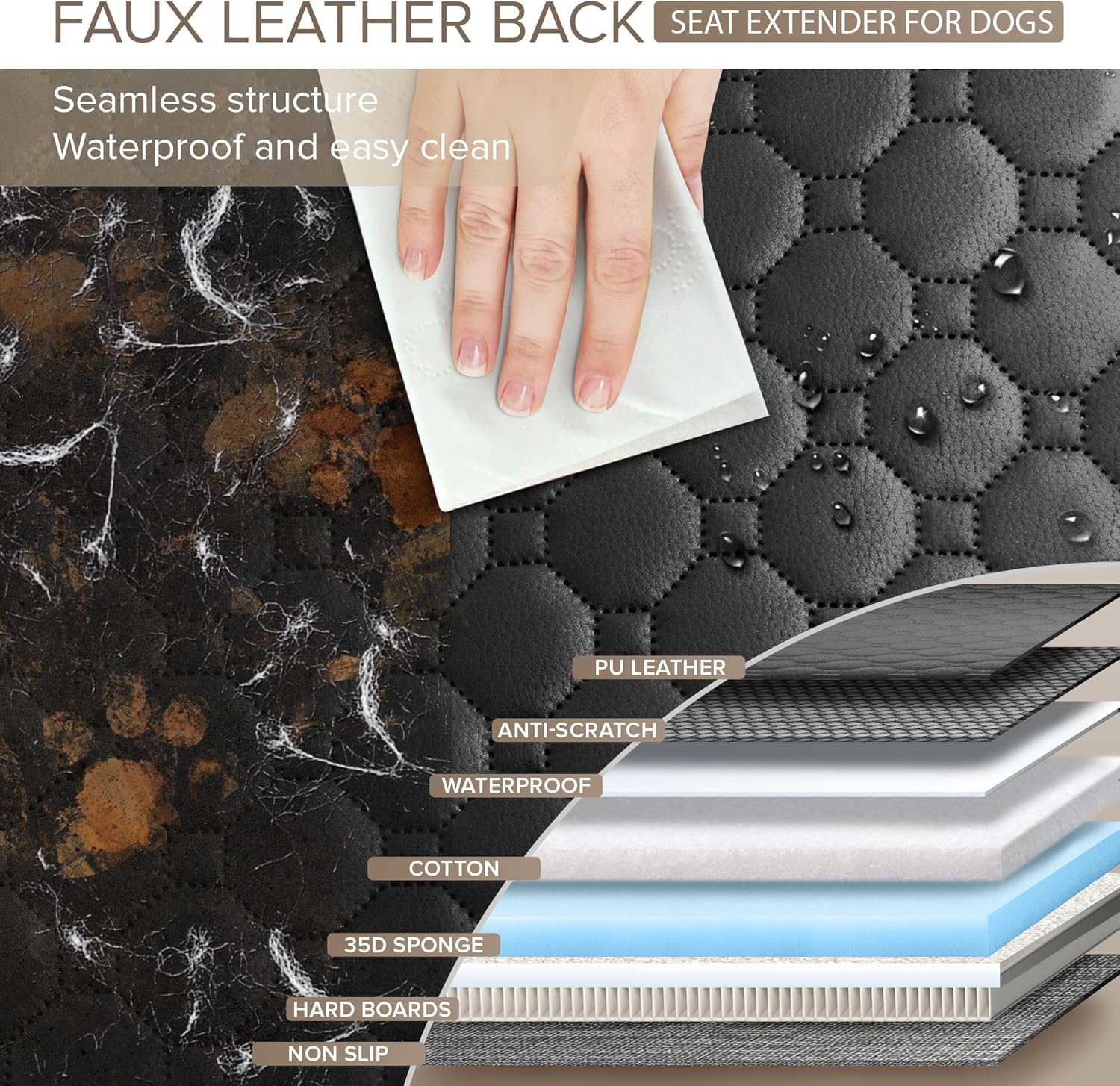 - Tripled Scratch resistant PU Leather backseat extender for dogs - Reinforced non-porous faux leather material make dog seat cover for back seat not only non-stick hair and waterproof but also 3 times more resistant to scratches than traditional fabrics. Dog hammock for car with faux leather layer distributes sharp impacts across a wider surface area, avoiding damage to car. Enjoy the backseat cover for dogs in car that looks and feels luxury and durability