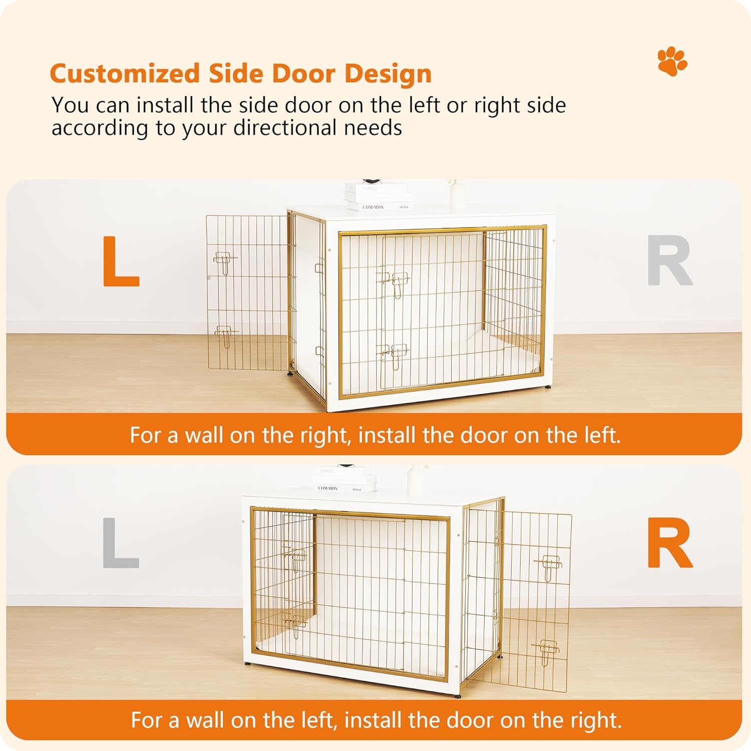 DWANTON Dog Crate Furniture with Cushion, Wooden Kennel Table with Double Doors, Indoor Dog House, Extra Large Size, 43.3" L, White+Gold