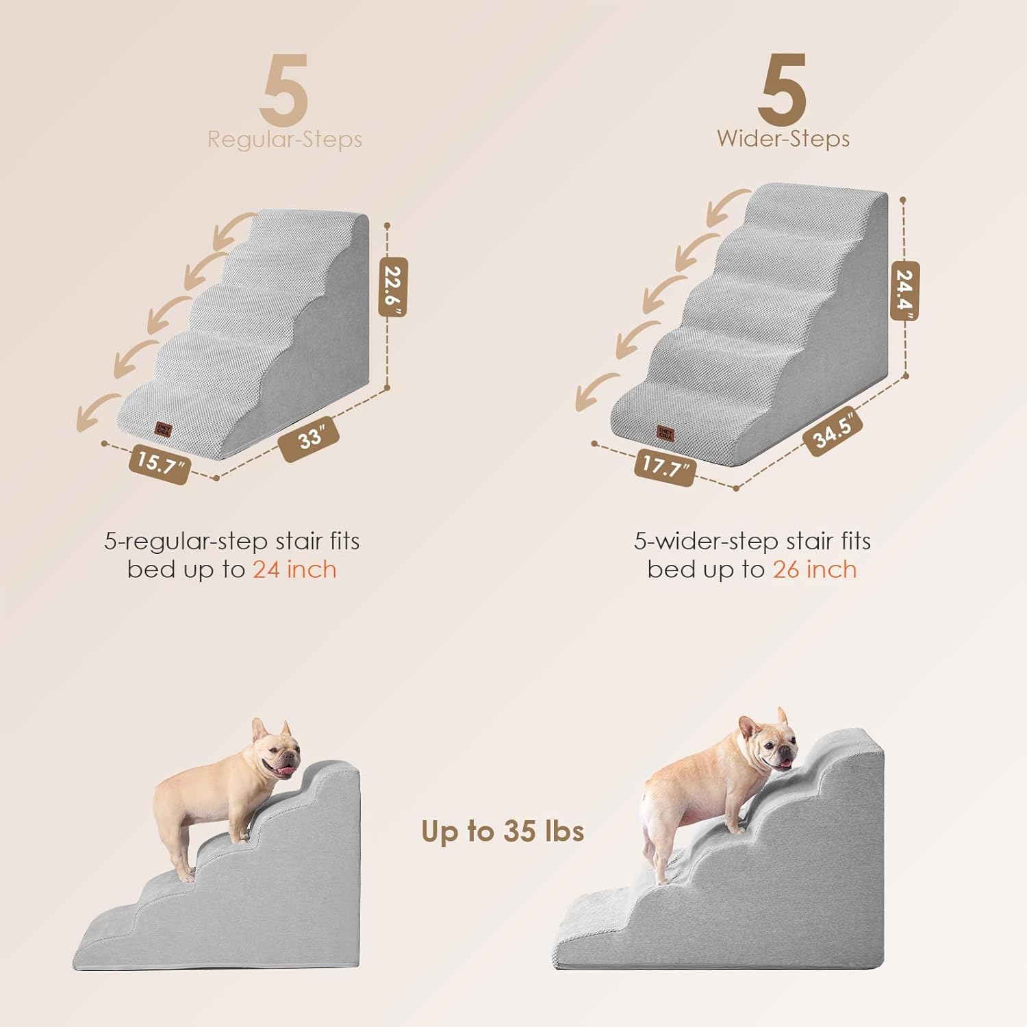 - MULTIPLE STEP SIZES - This dog stair has 2 steps, 3 steps, 4 steps and 5 steps to choose. Our 2-step stairs fits for chair/sofa/bed up to 13inch. 3-step stairs fits for chair/sofa/bed up to 17inch. 4-step stairs fits for chair/sofa/bed up to 21inch. And 5-step stairs fits for chair/sofa/bed up to 24inch.