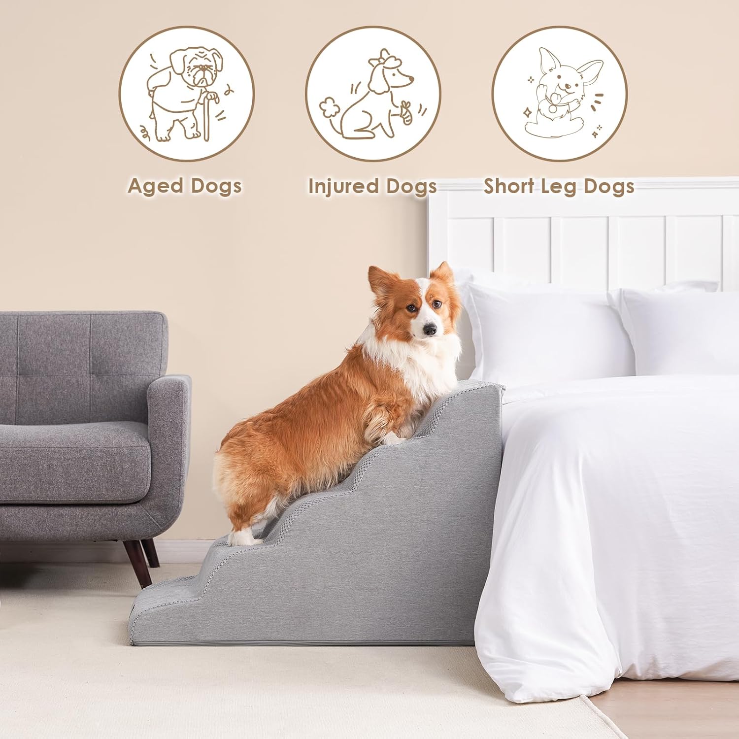 - COMFORTABLE PET STAIRS - This foam dog stair is designed directly against the edge of a bed, sofa or other furniture, so your pet can climb up and down comfortably.