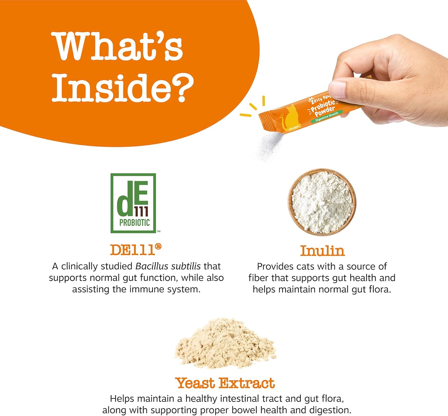 - Tummy Support for Your Feline's Tummy! - Zesty Paws Probiotic Powder for Cats combines a premium probiotic with Inulin (fiber for cats) and Yeast Extract to support digestion and immune system function for your cat.