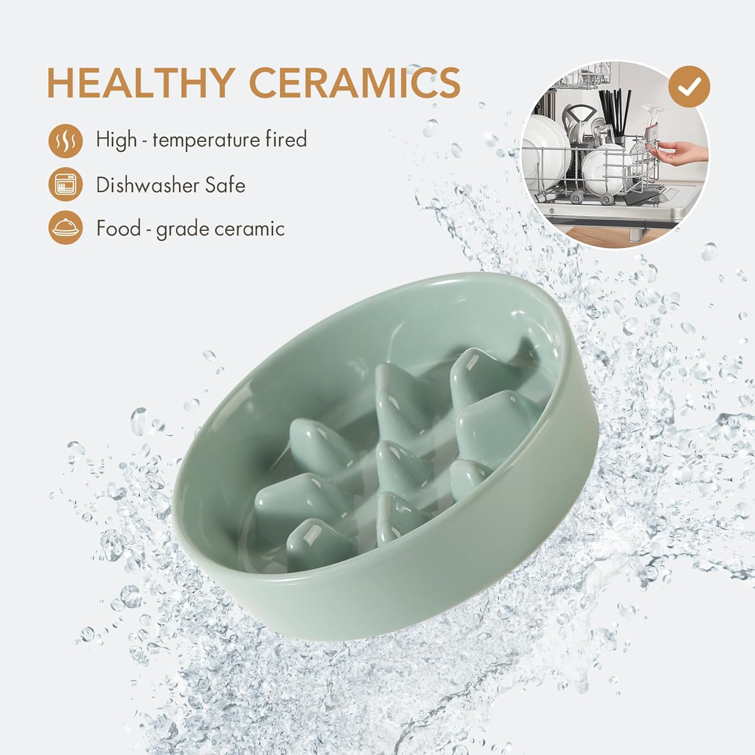Ceramic 6.1inch Dog Bowl Slow Feeder, Slow Pet Food Dish for Small Dog and Cat, Stop Bloat, Preventing Choking(Single Bowl, Light Green)