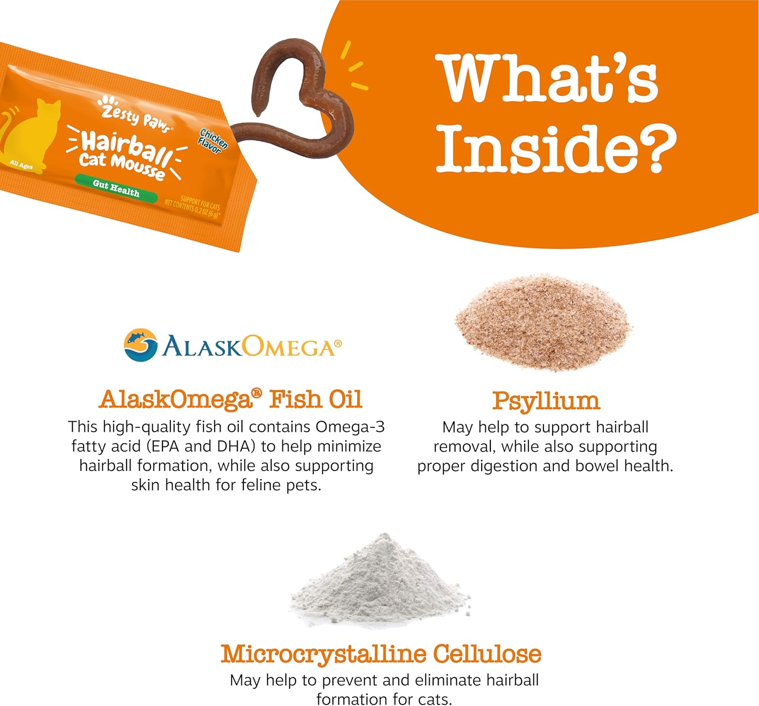 - Made with Premium AlaskOmega Fish Oil - These squeezable cat hairball treats contain high-quality fish oil contains Omega-3 fatty acid (EPA and DHA) to help minimize hairball formation, while also supporting skin health for feline pets.