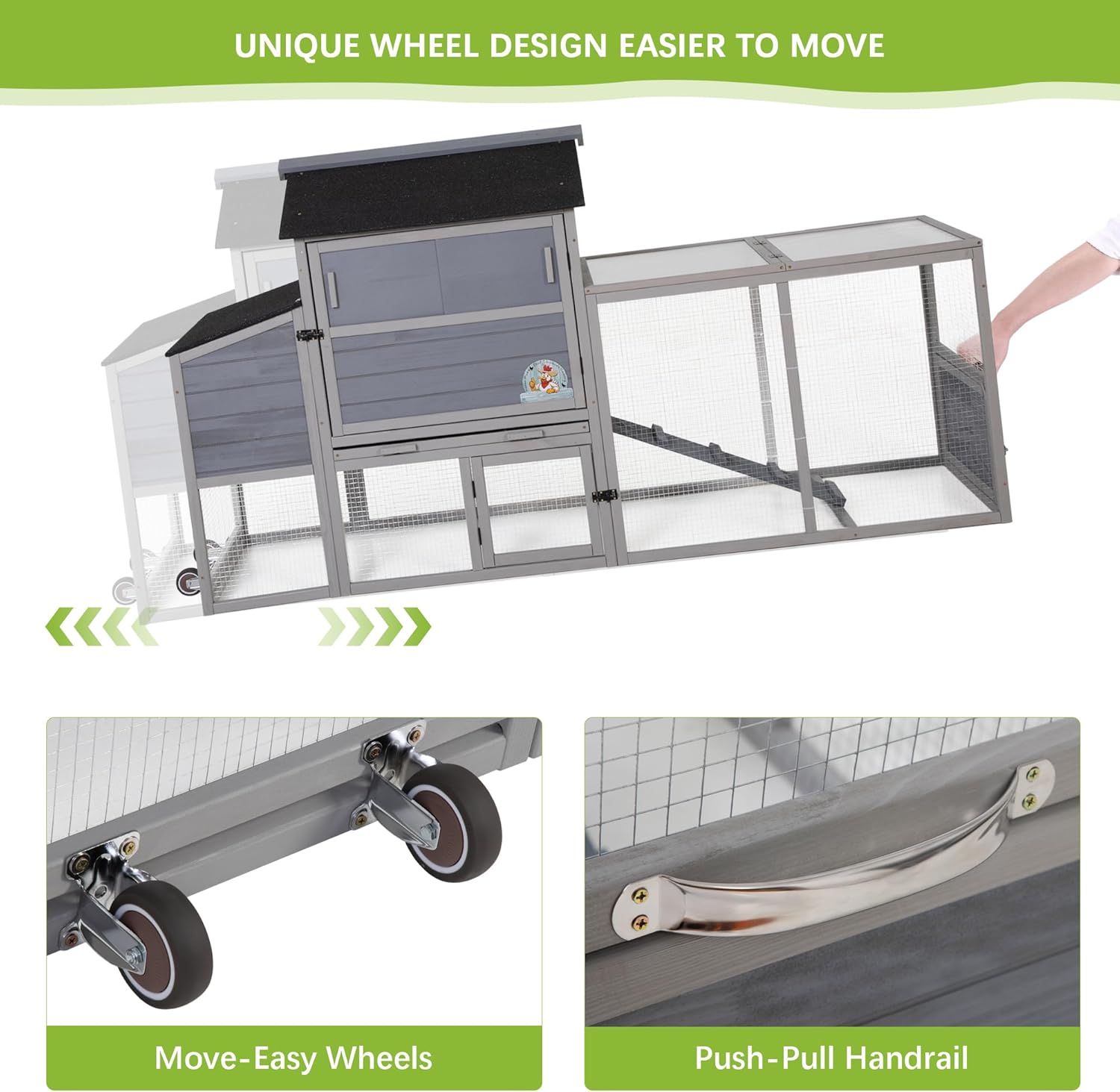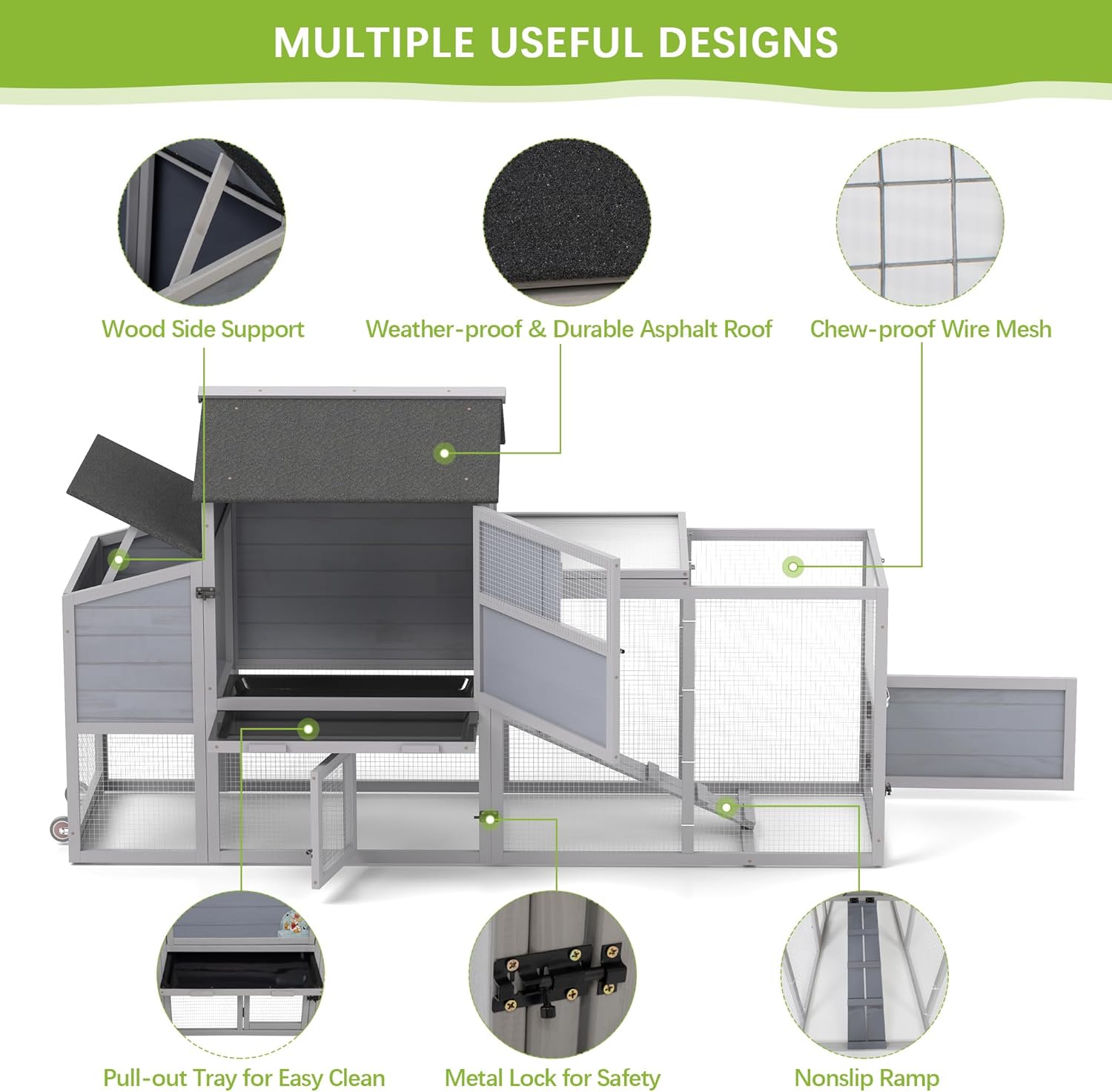 COZIWOW 82" Large Wooden Chicken Coop, Outdoor Rabbit Hutch, Guinea Pig Pet House with Wheels, Sunshine Board, Asphalt Roof, Ramp, Openable Top, Door, Window, Pull-Out Tray, Indoor Bunny Cage (Gray)