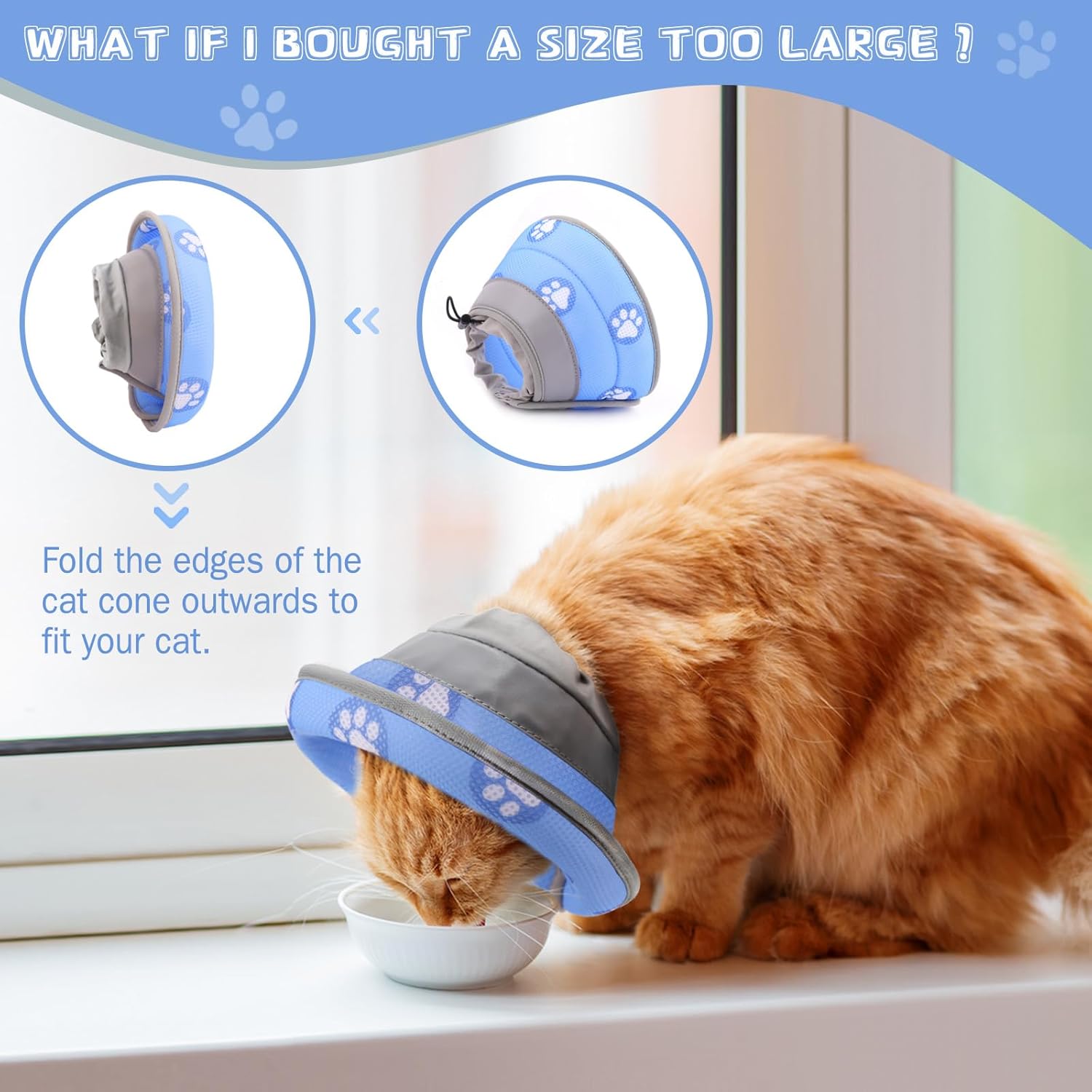 - Vision-Friendly Folding Edges - Understanding how pets dislike bulky cones that impede movement, our e collar for cats features a folding edge design that won't obstruct your cat's vision like traditional collars. This allows your cat to continue chasing butterflies, hummingbirds, and grasshoppers with ease while wearing the pet cone.