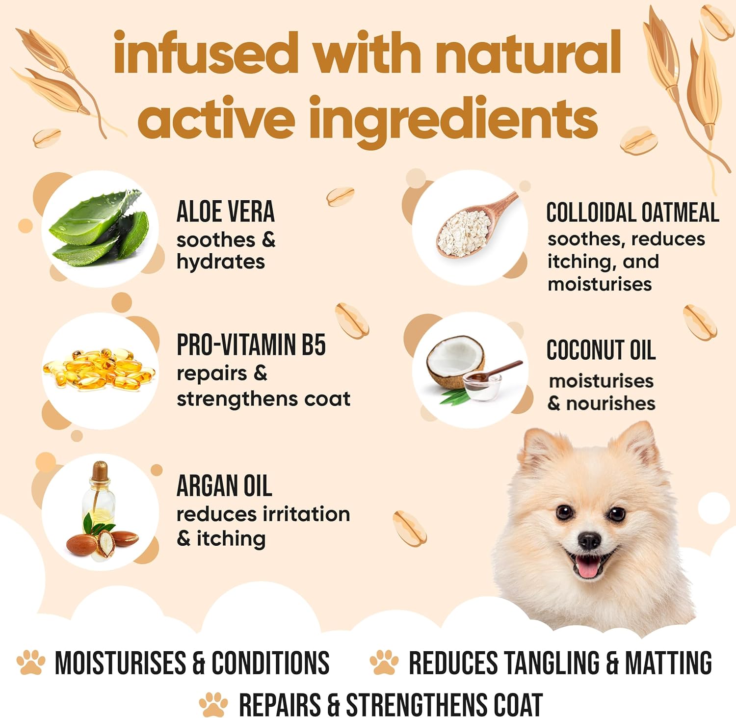 - SOOTHING ALOE VERA - We know your pampered pooch deserves the best. That's why we've packed 99% bio-active aloe vera into this moisturising conditioner. Filled with amino acids, antioxidants, and nourishing vitamins, this Oatmeal conditioner will tame matted coats and prevent static for easier dematting and detangling.