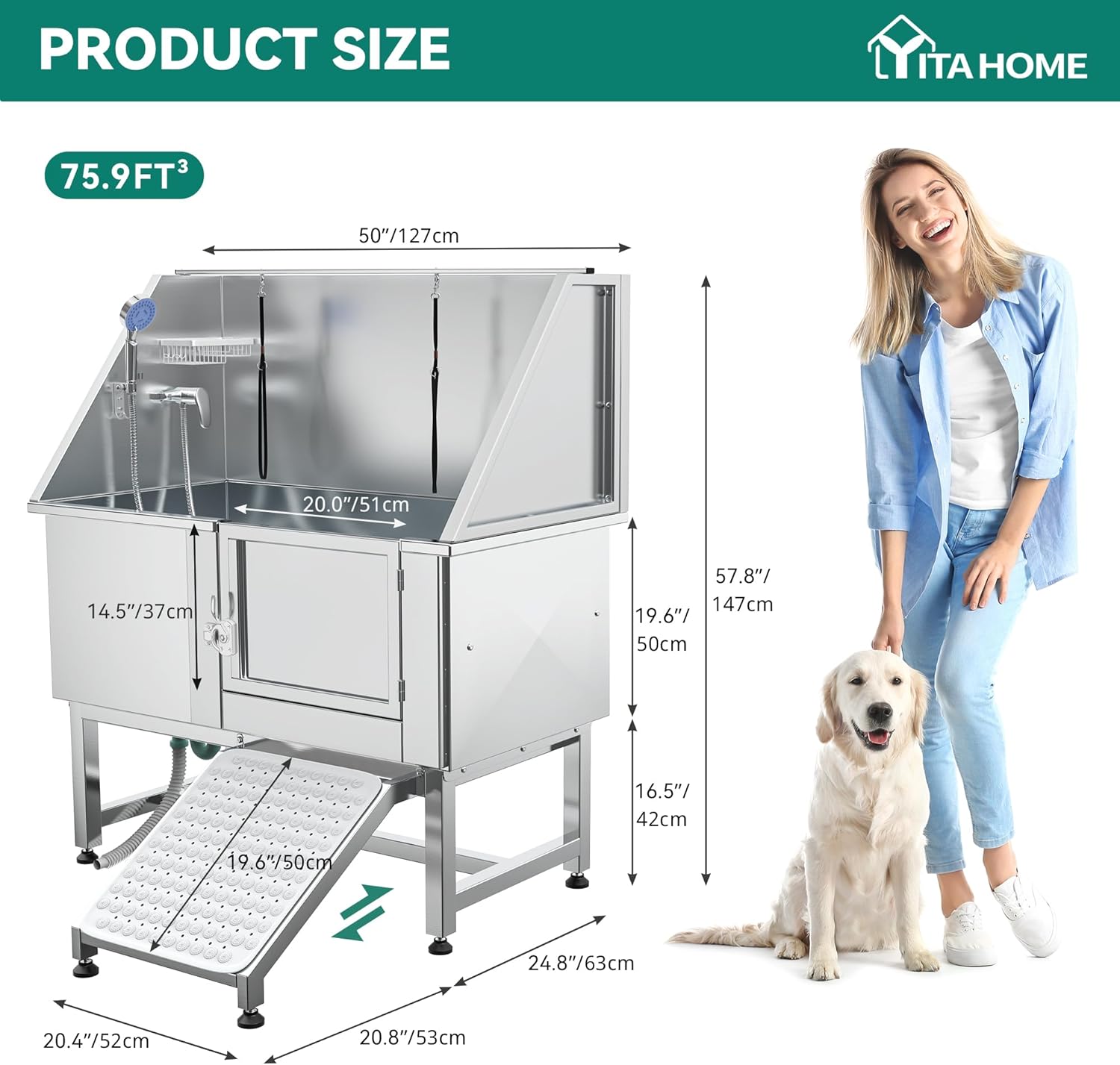 YITAHOME Dog Grooming Bathtub, Professional Stainless Steel 304 Dog Bathing Station w/Right Ramp, Faucet, Floor Grate, 50in Pet Washing Station for Large, Medium, Small Pets