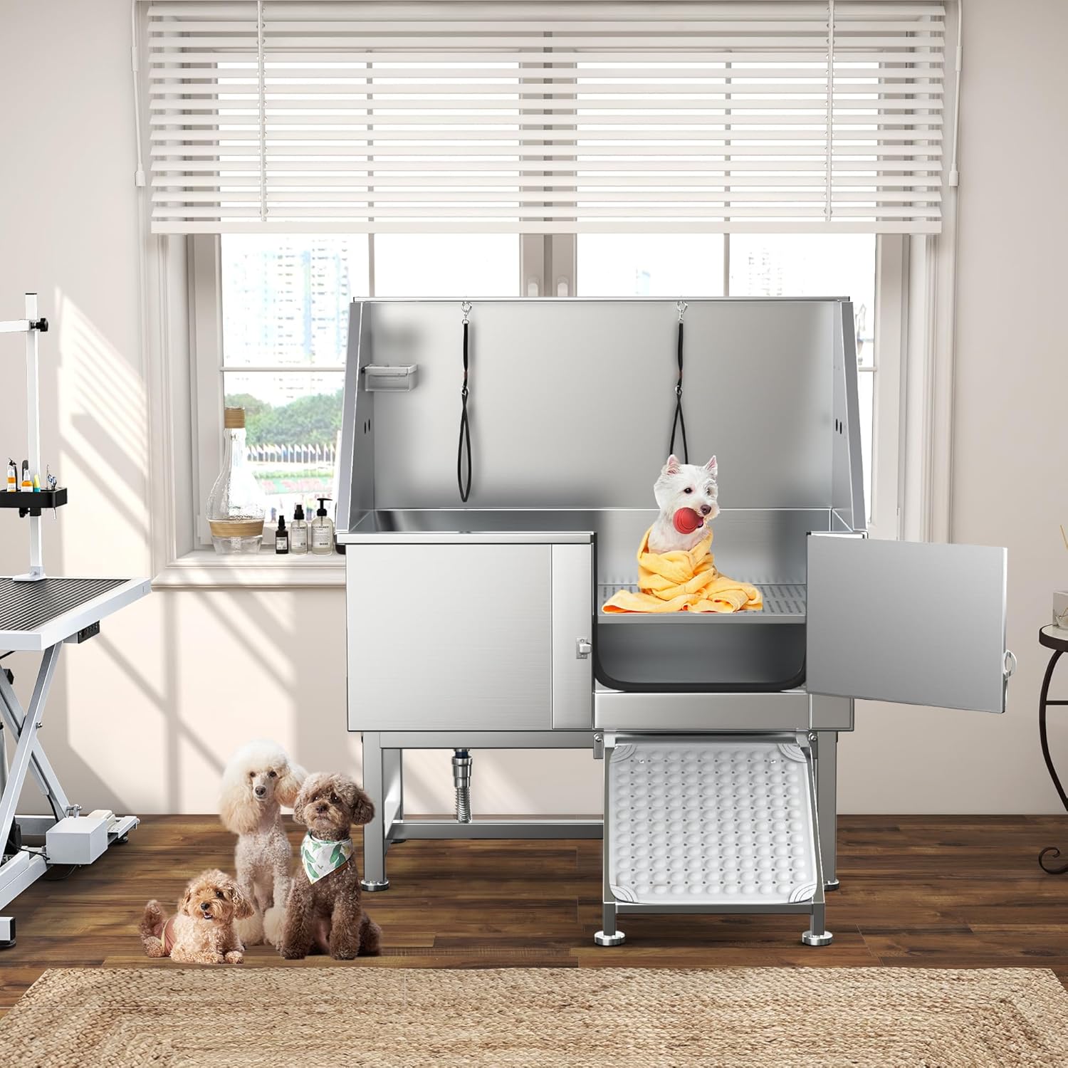 - Safe and Convenient: dog bathtub for large dogs includes a reliable door lock to prevent accidental opening; The hideable stair comes with a new limiting screw for secure stepping when pulled out; An attached leash holder can also be used to hang towels