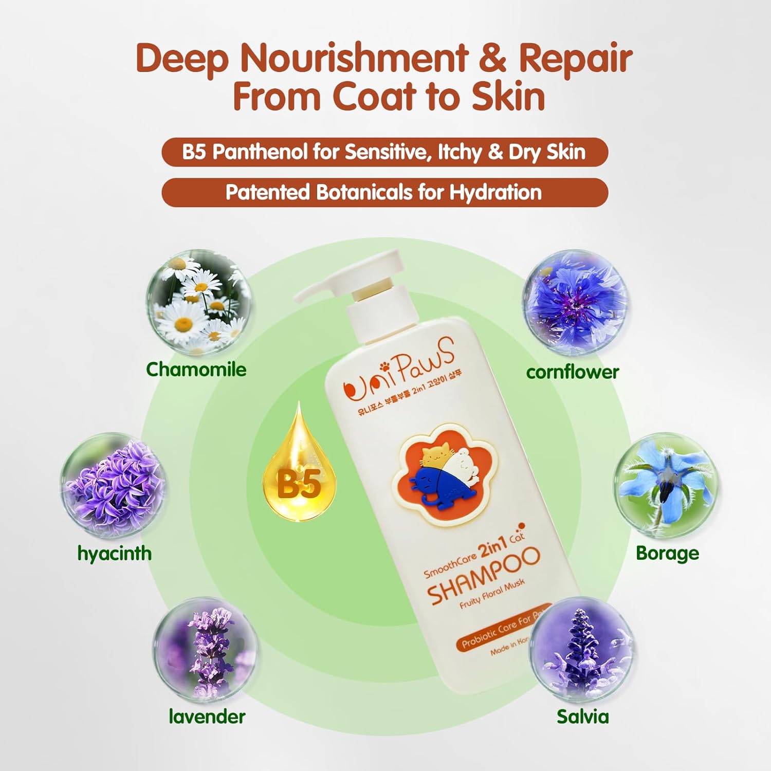 UNIPAWS Cat Shampoo & Conditioner 2-in-1, EWG Verified, Anti-Dandruff & Deshedding for Soft and Shiny Coat, Probiotics Smoothcare for Itchy, Dry Skin, Gifts for Cat Lovers, Made in Korea, 16.9 Fl Oz