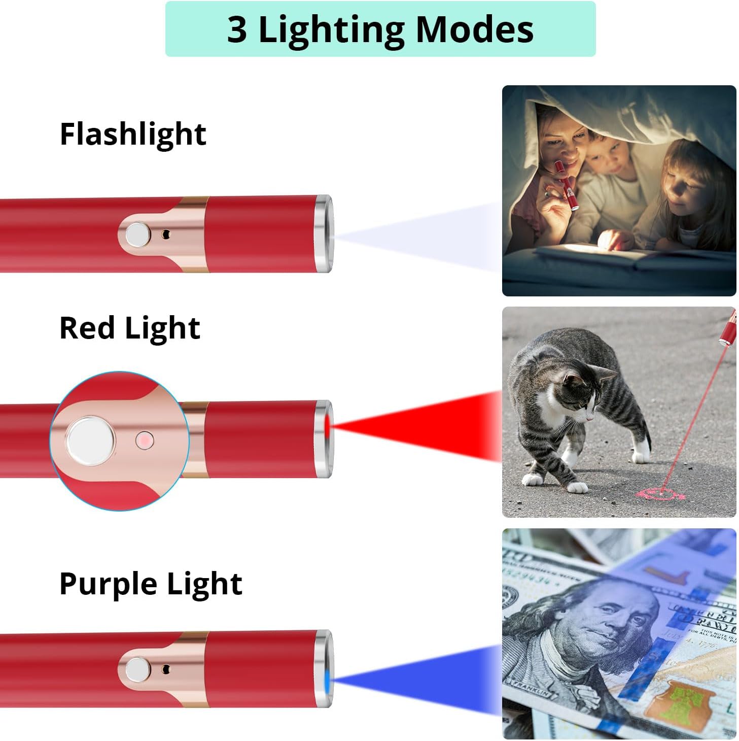 - Multiple Function: The cat toy can also make you a presenter. It is very bright. Plus, you can turn on the switch with a single press. White mode can glow in the dark; Purple mode can detect money.
