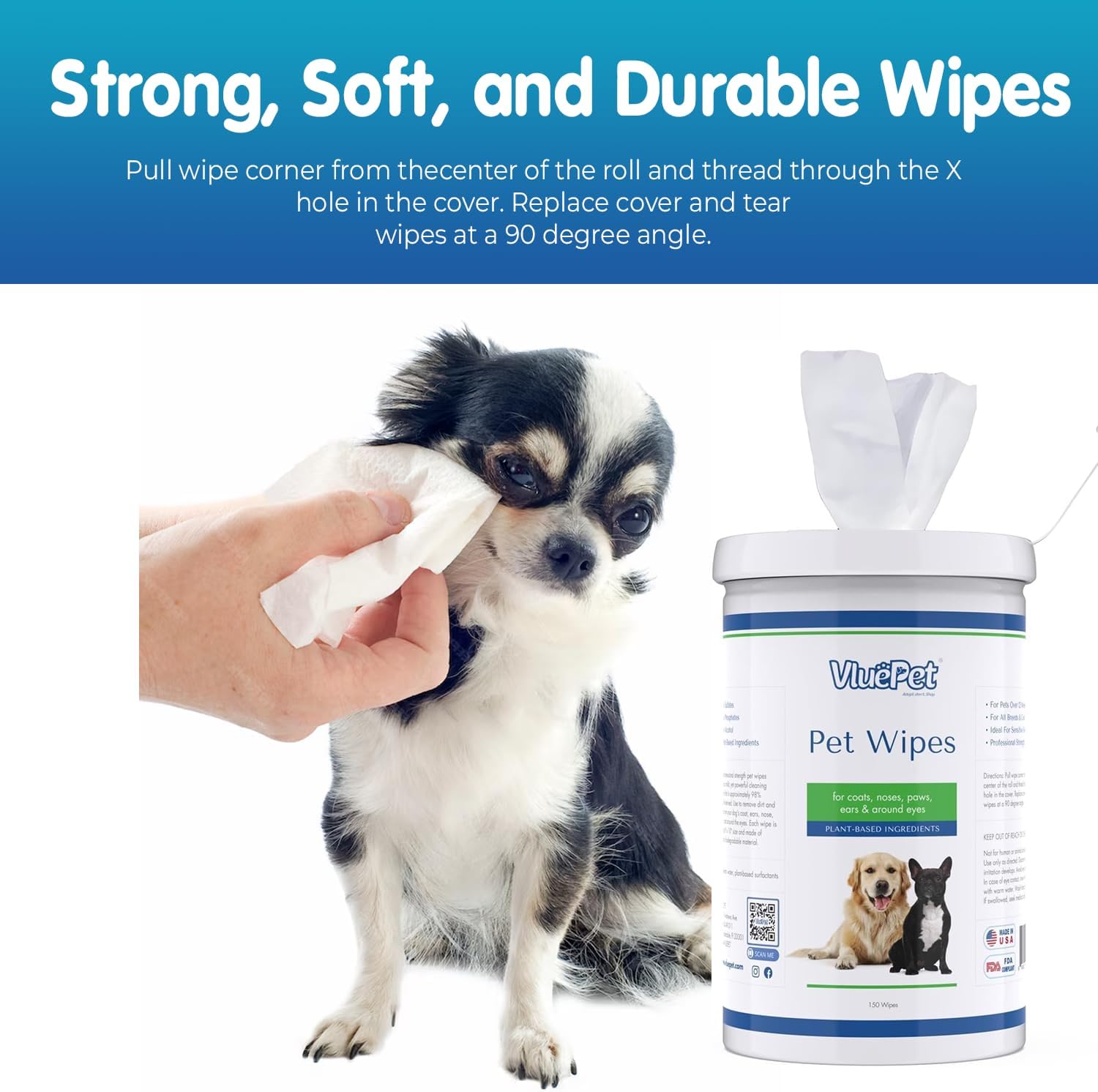 - VLUEPET PET WIPES FOR DOGS AND CATS: These dog grooming wipes are a fast, convenient way to freshen up your pet every day. Our dog’s ear wipes easily remove daily dirt and odor with a quick wipe down, alongside soothing dry, itchy skin. This includes one pack of 150 wipes. It is Ideal for Home and travel.