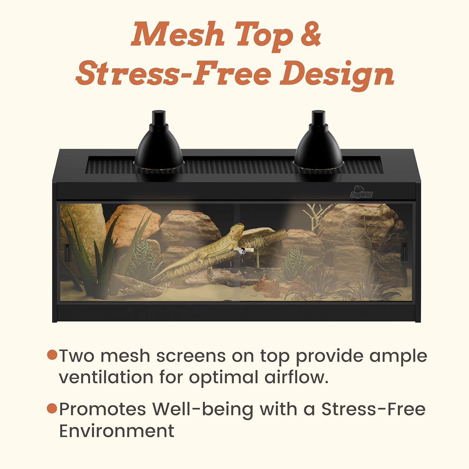 - 【Secure Glass Door & Ventilated Top】Features a front-opening tempered glass door with a lock and handle for easy access and security. The durable mesh top ensures excellent ventilation and allows UVB and heat penetration, creating a comfortable habitat for your pets.