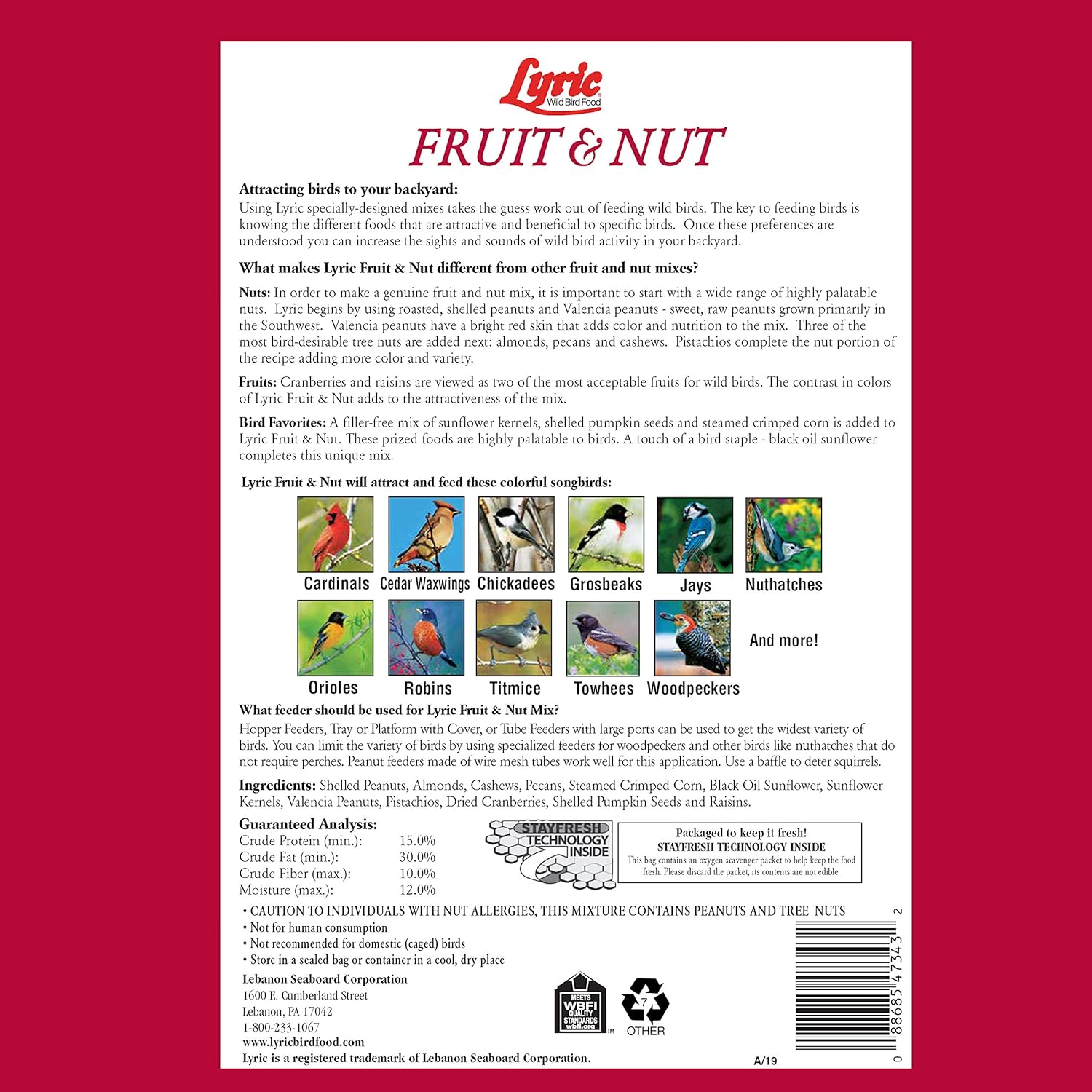 Lyric Fruit and Nut Wild Bird Seed - High Energy Wild Bird Food Mix - Attracts Woodpeckers, Chickadees & Other Songbirds - 10 lb. (pack of 2 - 5 lb bags)
