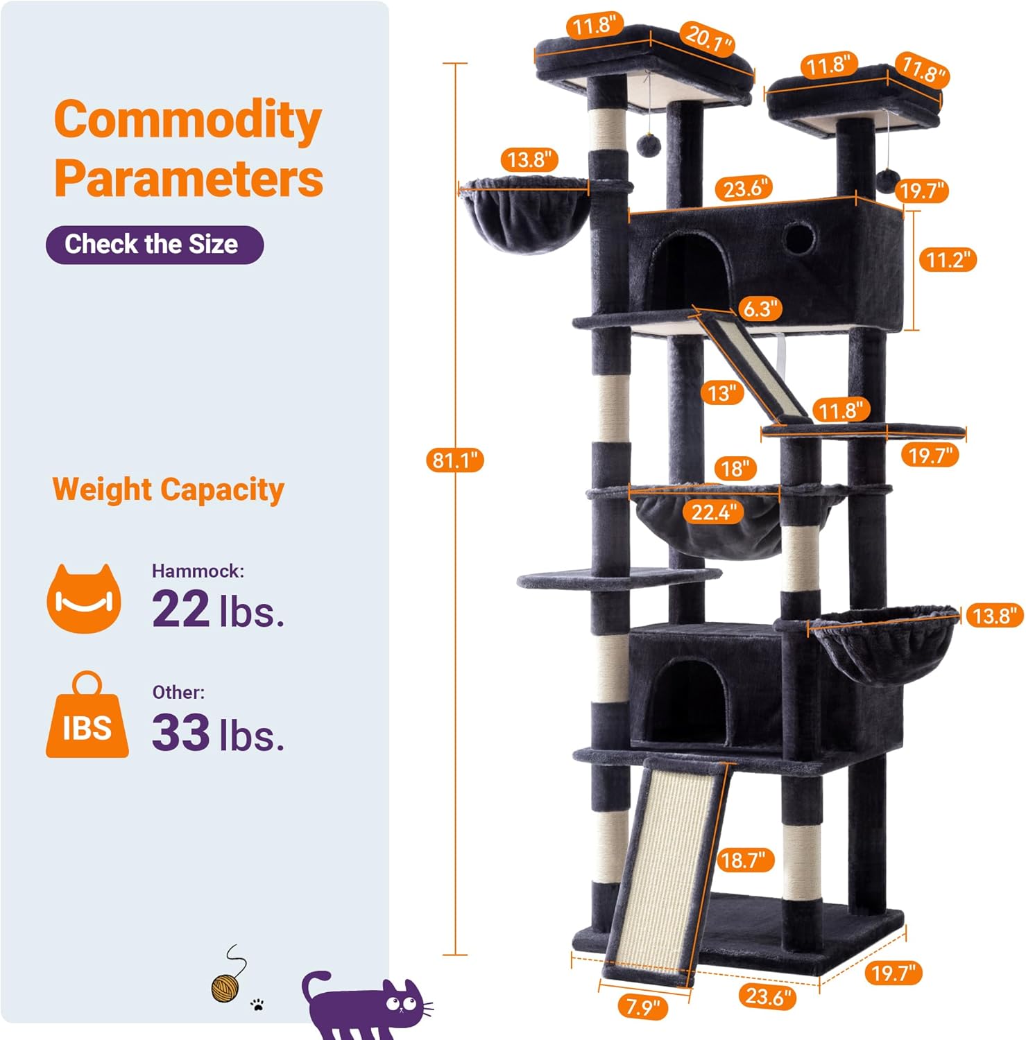 Allewie 81 Inches Tall Cat Tree/Multi-Level Large Climbing Tree House and Towers for Big Feline/Condo and Hammock/Scratching Post/Wide Base/Dark Grey