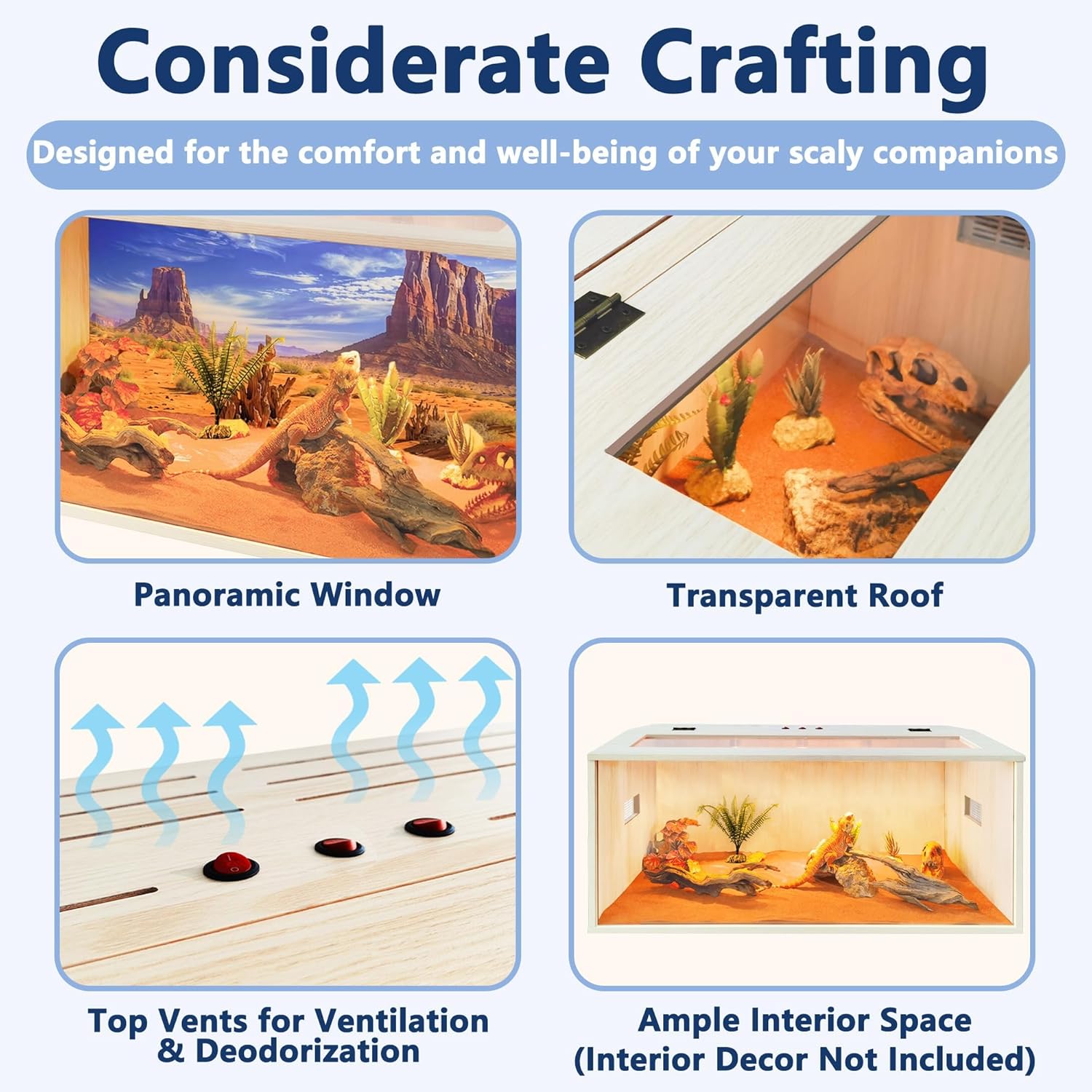 Prolee Reptile Terrarium, Lizard Tank Up to 68 Gallons, Bearded Dragon Tank with Roof Door, Snake Tank with Built-in Lamp Fixture and Switch (68 Gallon, 48" Long, Openable Wood Roof)