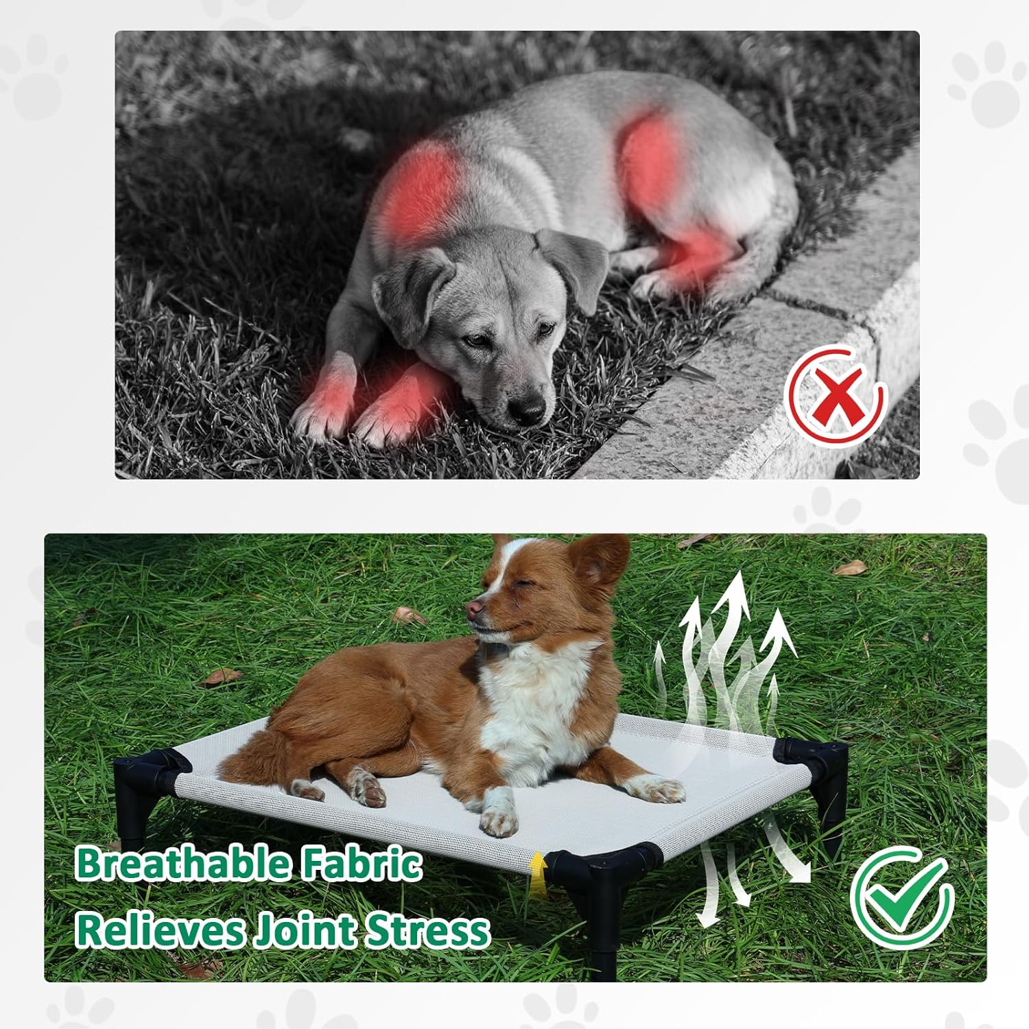 - BREATHABLE TESLIN MESH: This outdoor dog bed comes with breathable and durable Teslin mesh, provides airflow and firm support to relieve joint pressure. Our dog cot bed is suitable for dogs of all life stages, from puppy to the senior