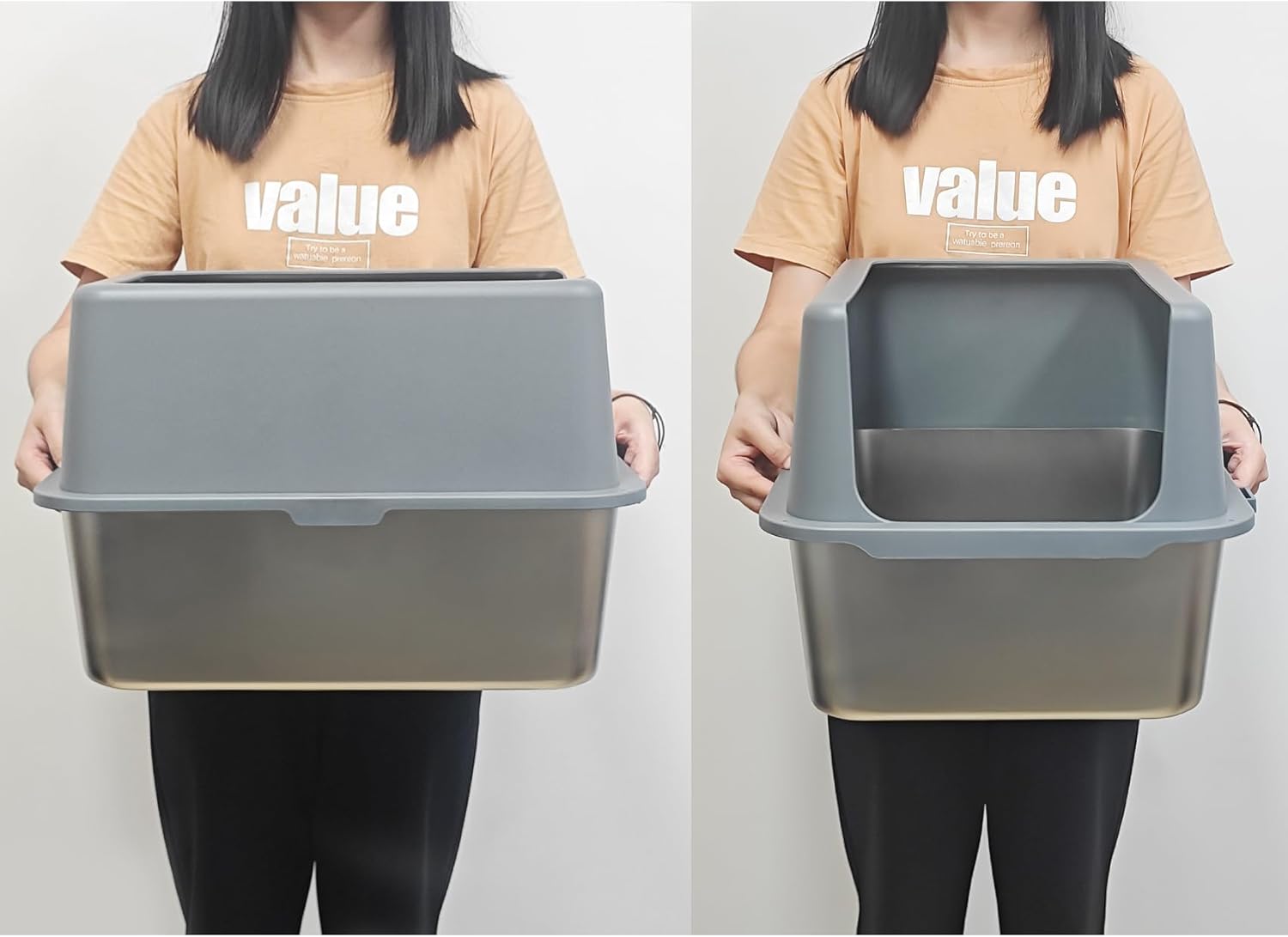 - Litter Box High Sides Design: The rim of the extra large stainless steel litter box is wide and overlaps the edge of the lid completely. No more worrying about the lid being kicked over. Overlapping design of this cat litter tray keeps urine and litter in the large stainless steel litter box and won't seep out through the seams, keeping the air fresh.