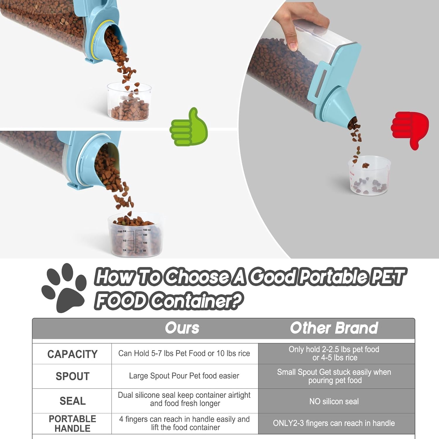 - BENEFITS : Upgraded Large Pour Spout with Measuring Cup-We upgraded the mold so that the pour spout is large enough to pour out large dog food.You can now pour food easily and quickly.The newly upgraded measuring cup can now also be easily screwed onto the nozzle