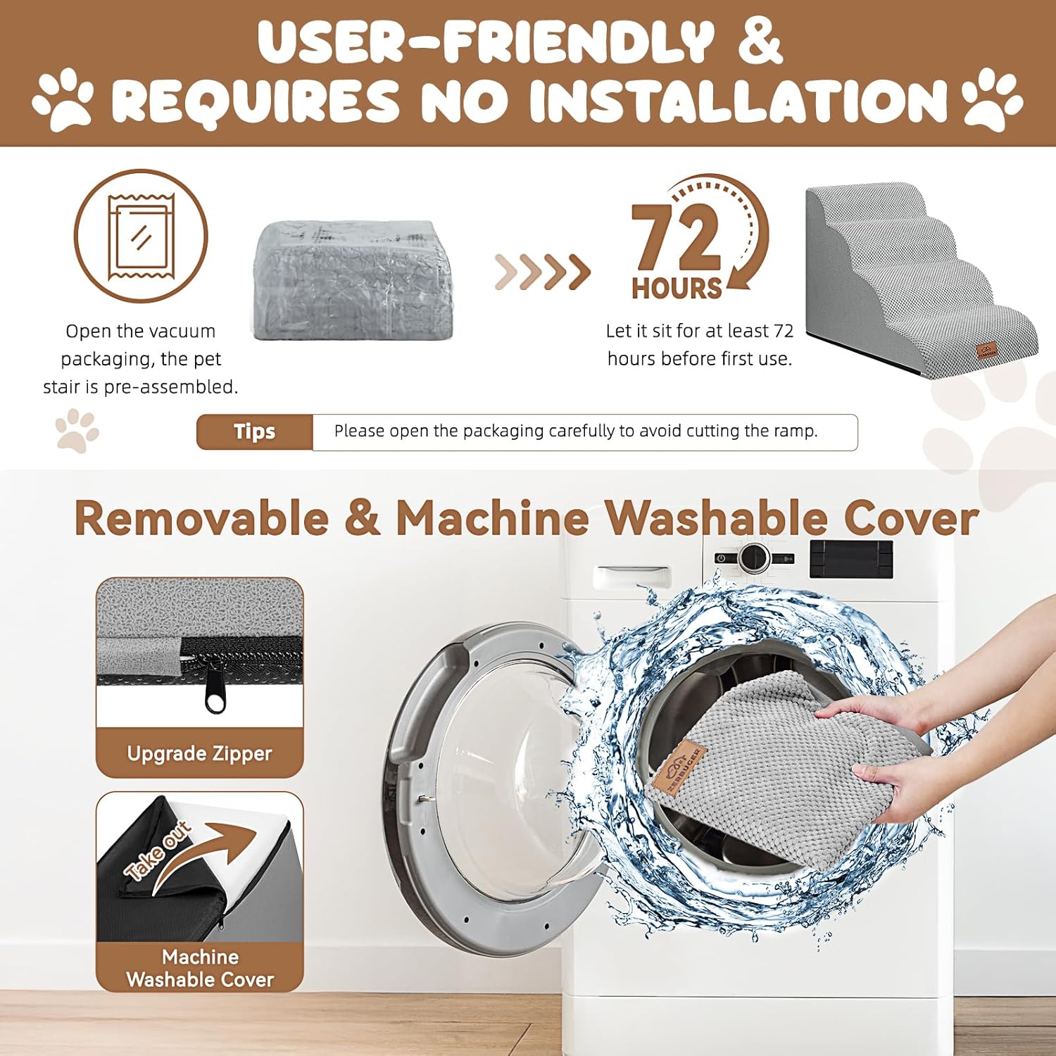 - No Assembly Required & Easy to Clean: When you open the packaging, the pet stair is already assembled. Before the first use, it should be left standing for at least 48-72 hours for the foam to fully expand. NOTE!! Open the packaging carefully to avoid cutting the stair! The outer cover can be removed for cleaning and supports machine washing or hand washing. Please note that the inner foam is not washable.