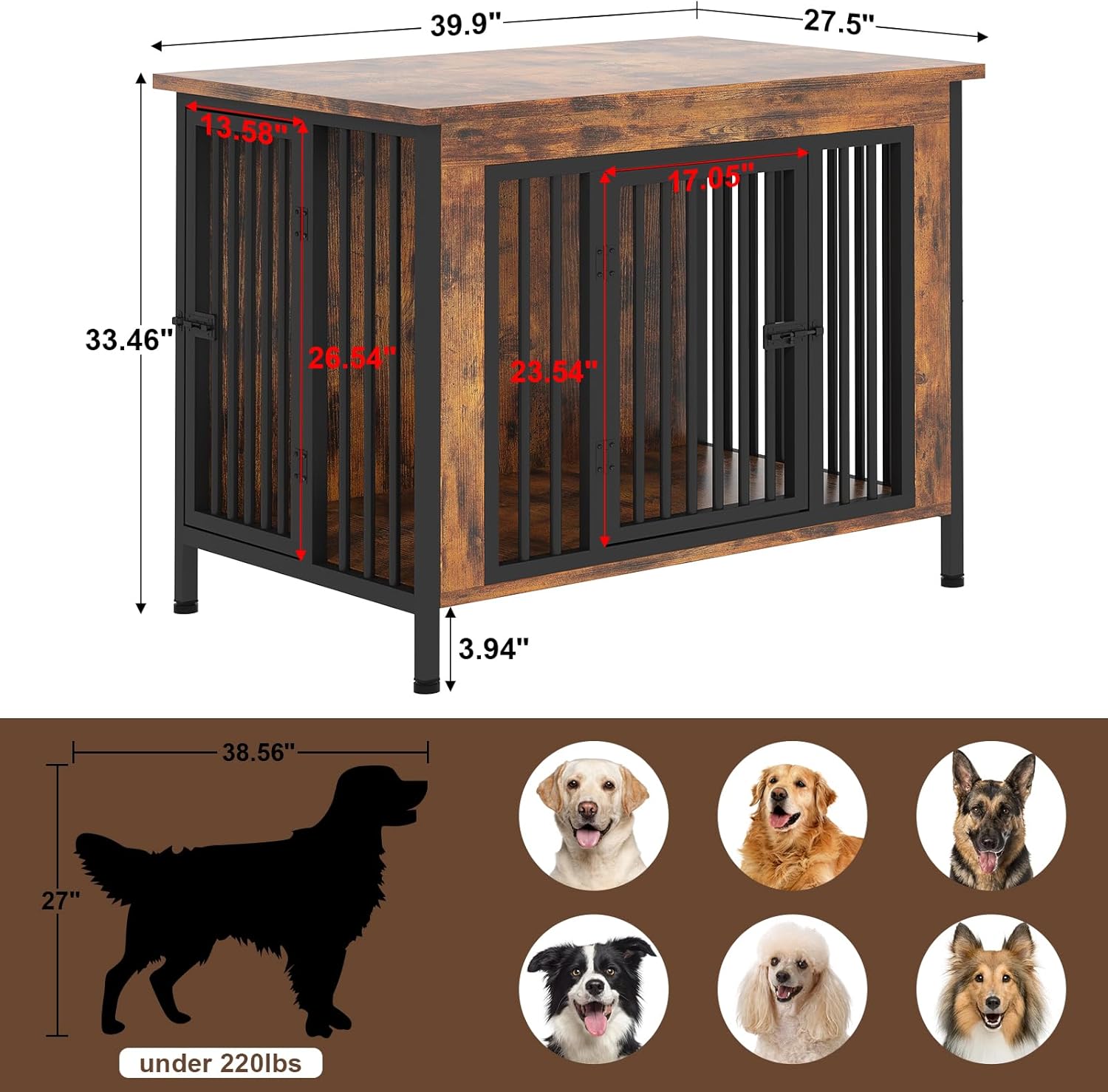 - 【Comfortable Space for Dogs】: With 40" W x 27.56" D x 33.07" H dimension, the dog kennel furniture can allows dogs to stand freely and turn around easily in the crate. Dogs can have a comfortable and spacious living space, avoiding anxiety and unease due to limited space.