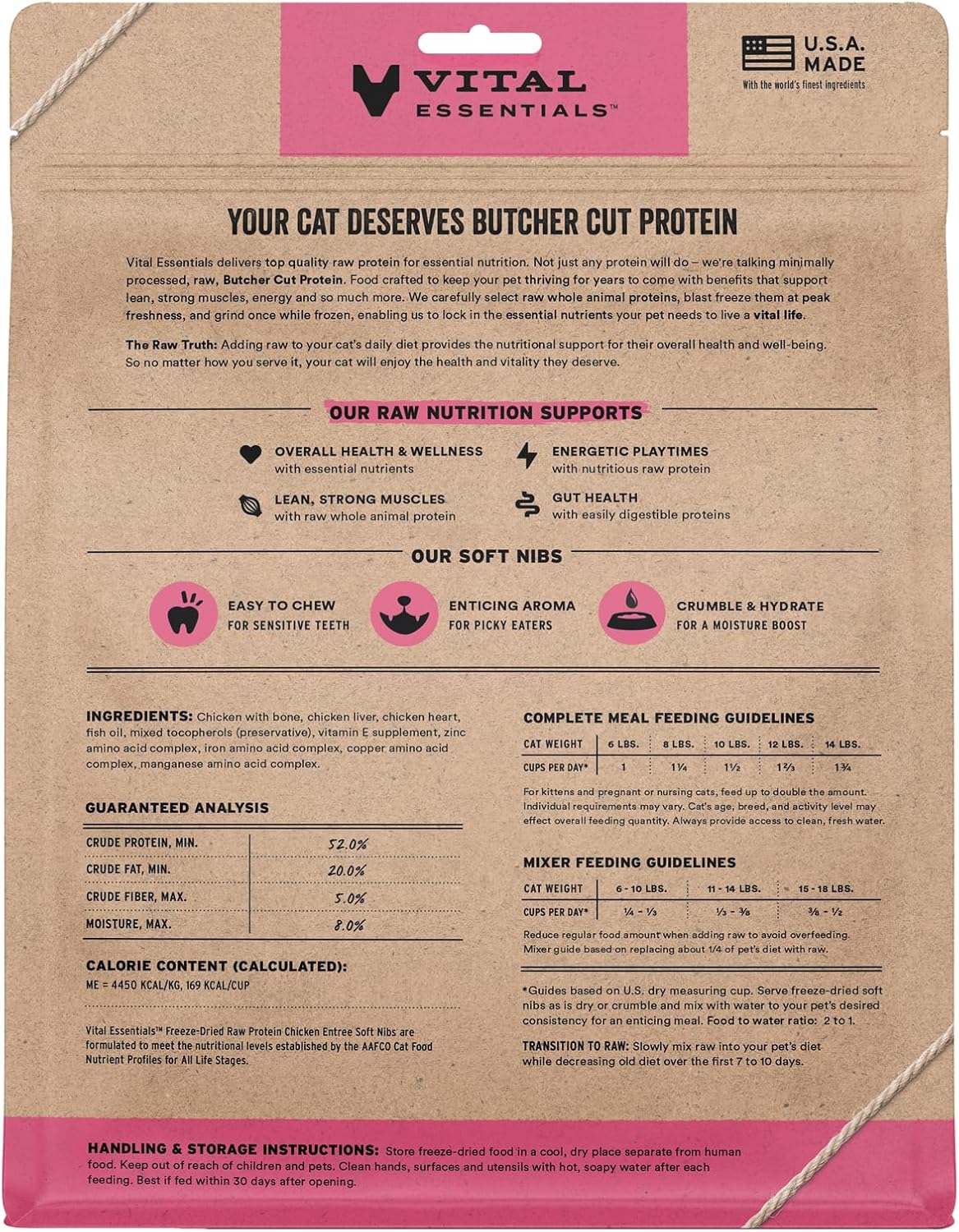 - SOFT NIBS FREEZE-DRIED RAW CHICKEN CAT FOOD: Vital Essentials Freeze Dried Cat Food packs more protein than industry standard into every soft bite to deliver the peak vitality your cat deserves, especially when compared to dehydrated cat food. Our complete and balanced freeze-dried raw cat food is made with Butcher Cut premium chicken, responsibly sourced in the USA.