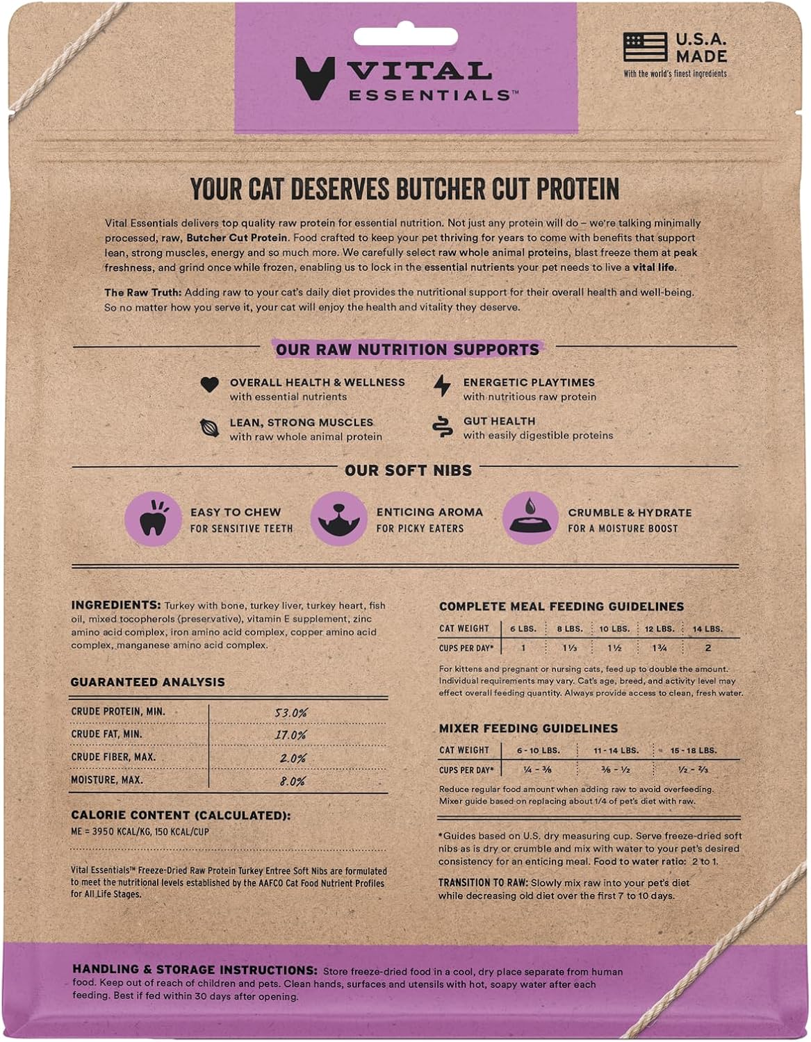 - SOFT NIBS FREEZE-DRIED RAW TURKEY CAT FOOD: Vital Essentials Freeze Dried Cat Food packs more protein than industry standard into every soft bite to deliver the peak vitality your cat deserves, especially when compared to dehydrated cat food. Our complete and balanced freeze-dried raw cat food is made with Butcher Cut premium turkey, responsibly sourced in the USA.