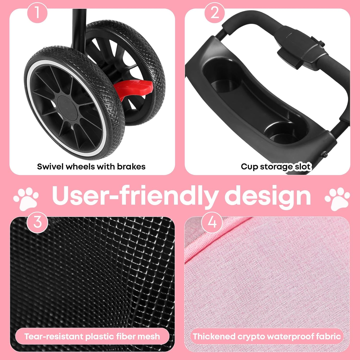 - [All-Terrain Safety & Control] The cat stroller equipped with 360° swivel front wheels for smooth maneuverability and dual rear brakes for instant stopping power. It glide seamlessly on sidewalks, grass, or uneven terrain, ensuring a safe ride